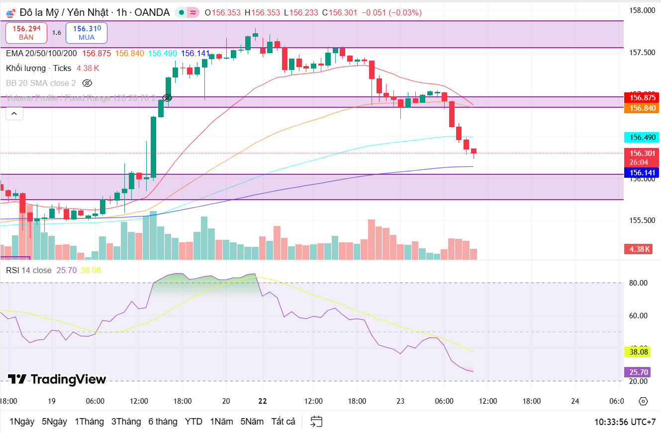 Trên khung H1, USD/JPY cho thấy cấu trúc giảm ngắn hạn khá rõ. Giá đã phá vỡ vùng hỗ trợ quan trọng trước đó và liên tục tạo đỉnh thấp hơn – đáy thấp hơn. Các đường EMA ngắn hạn (EMA20–50) bắt đầu dốc xuống, trong khi giá bị nén dưới cụm EMA này, cho thấy áp lực bán đang chiếm ưu thế.
