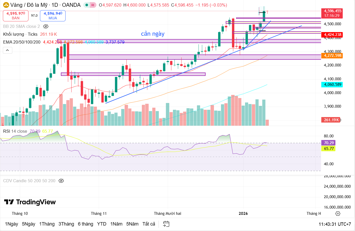 Trên khung ngày (D1), XAUUSD vẫn duy trì cấu trúc tăng trung hạn khi giá tiếp diễn nằm trên các đường EMA dài hạn (EMA50, EMA100 và EMA200). Tuy nhiên, đây đang là vùng giá tương đối nhạy cảm khi đã có dấu hiệu sớm của phân kì dương, cảnh báo khả năng xuất hiện các nhịp điều chỉnh kỹ thuật về vùng hỗ trợ 4420.
