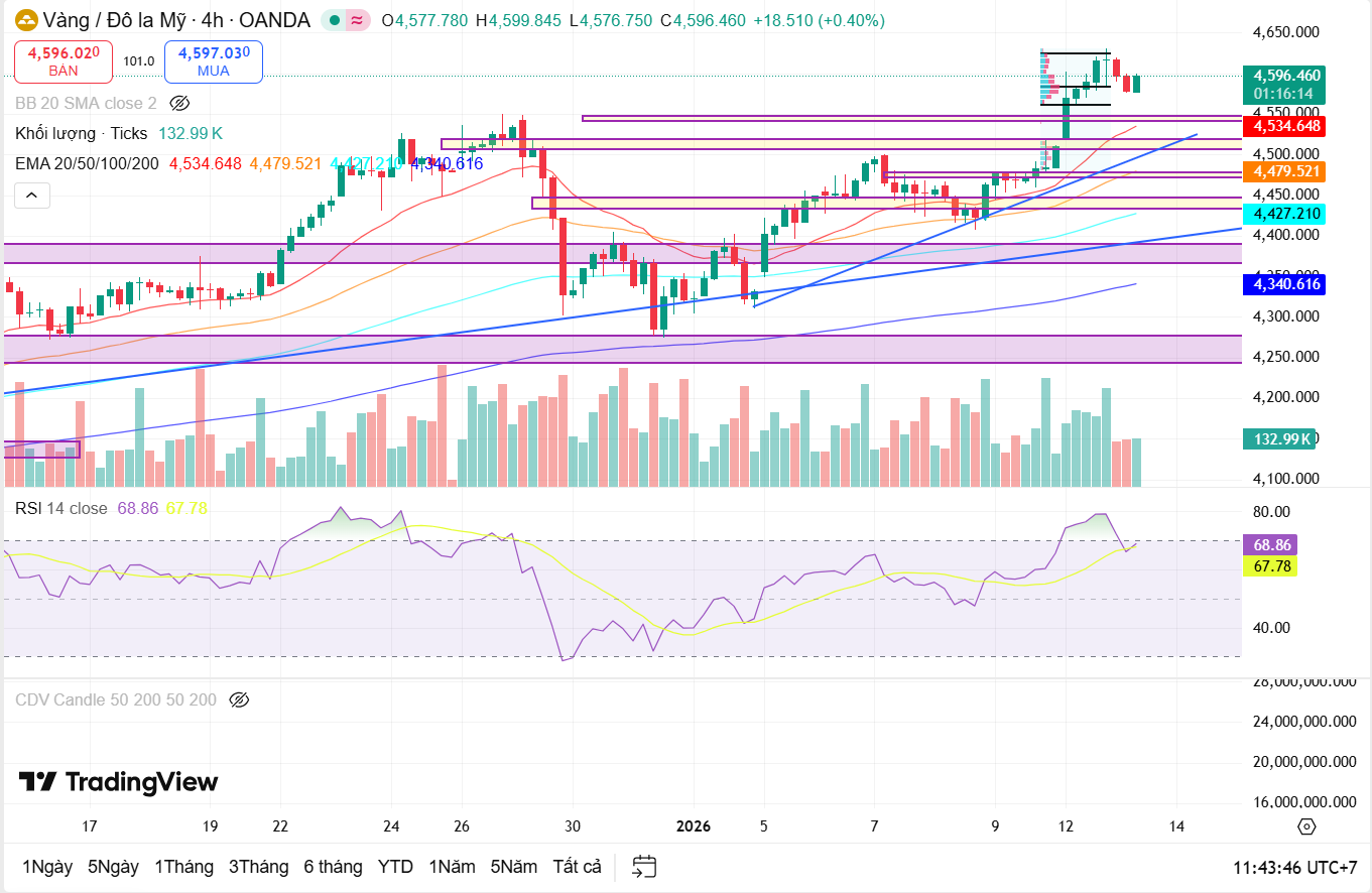 Ở khung H4, dấu hiệu tăng nóng đã suất hiện vào nhịp điều chỉnh đã xuất hiện ở vùng 4600 sau khi chỉ số RSI đã chạm ngưỡng quá mua. Trước mắt, vùng mục tiêu sẽ là 4530 khi đây là hỗ trợ hợp lưu giữa đường EMA20 và đường xu hướng tăng của khung H4.