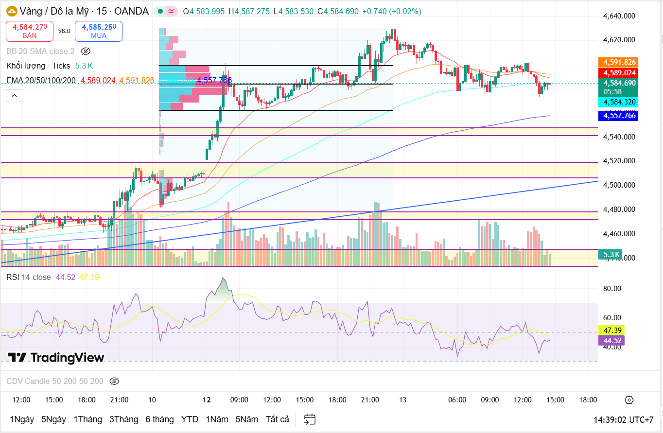 Ở khung M15, thị trường thể hiện rõ tính giằng co trong ngắn hạn, với biên độ dao động hẹp và các nhịp tăng giảm xen kẽ quanh các đường EMA ngắn hạn. RSI dao động gần vùng trung tính cho thấy động lượng không nghiêng hẳn về bên nào. Hiện tại, giá đã kiểm định thất bại vùng tranh chấp 4583 và nhiều khả sẽ hướng tới vùng hỗ trợ động 4557-4560.