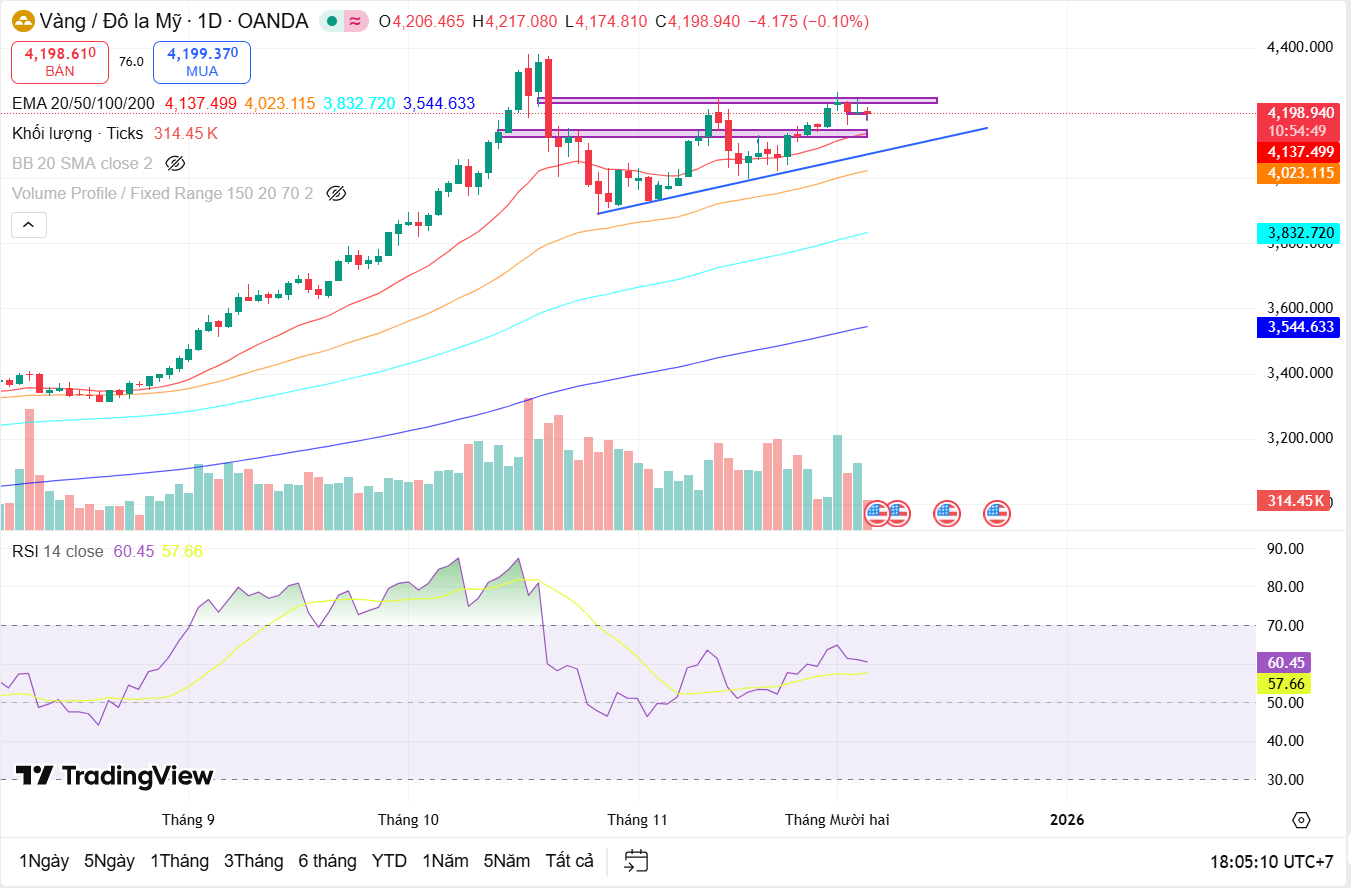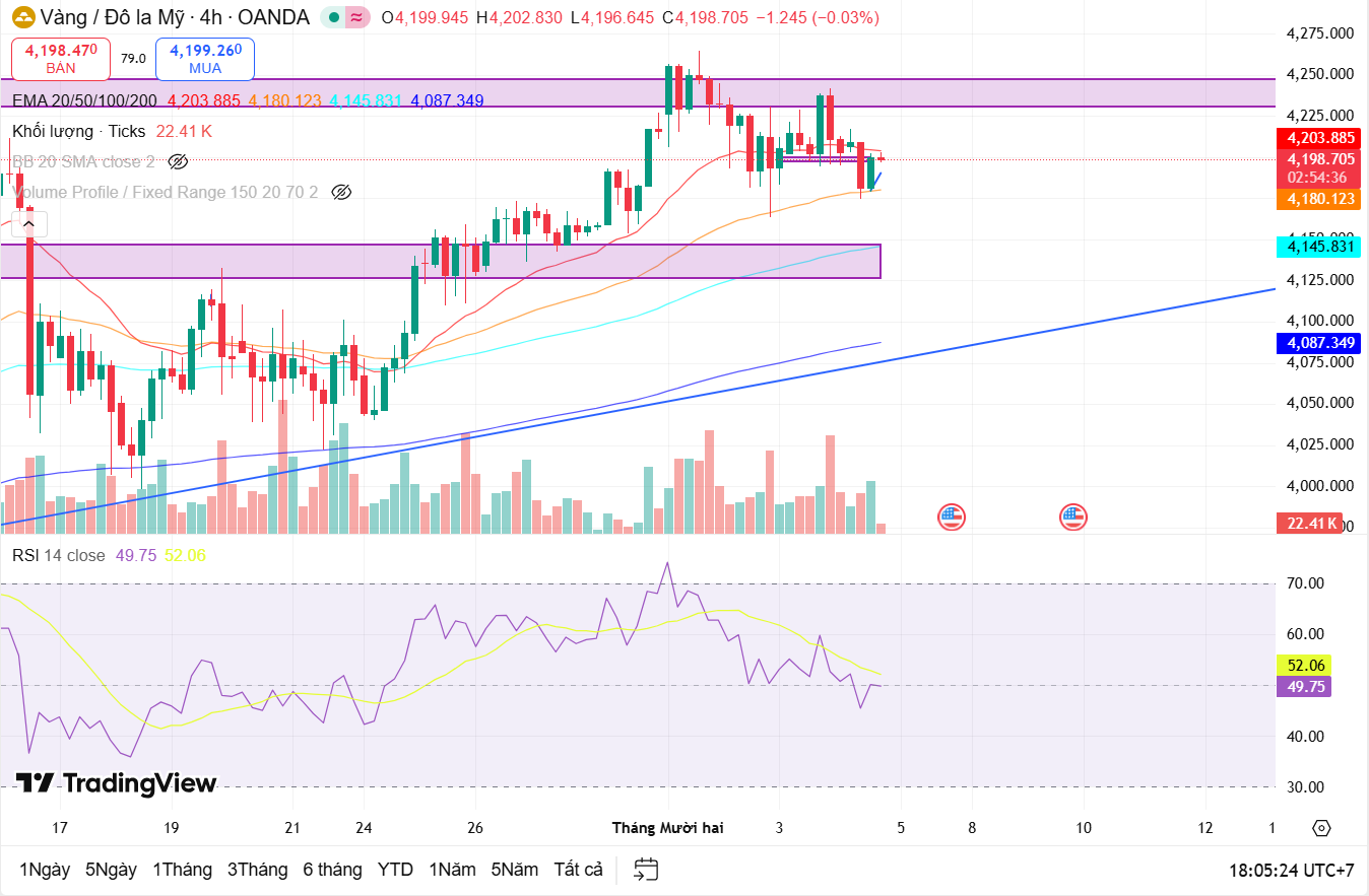 Quan sát khung thời gian 4 giờ (H4), trạng thái giằng co được thể hiện rõ nét hơn khi giá đang di chuyển trong biên độ hẹp, bị kẹp giữa đường EMA 20 và vùng hỗ trợ của EMA 50. Chỉ báo RSI đi ngang quanh mốc 50 phản ánh tâm lý lưỡng lự của nhà đầu tư, khi chưa phe nào thực sự kiểm soát hoàn toàn thị trường. Vùng giá 4.180 USD đang đóng vai trò là chốt chặn quan trọng của phe mua trong ngắn hạn; miễn là giá còn giữ trên mức này, cấu trúc tăng giá trung hạn vẫn được bảo toàn. Ngược lại, áp lực bán đang hiện hữu quanh vùng kháng cự tâm lý 4.225 USD, nơi từng xuất hiện các bóng nến từ chối giá trước đó.