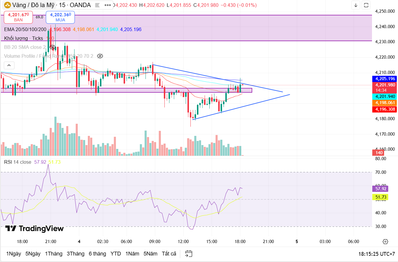 Ở các khung thời gian nhỏ hơn là 1 giờ (H1) và 15 phút (M15), thị trường đang thể hiện sự nhiễu động đặc trưng của giai đoạn "chờ tin". Trên biểu đồ H1, các đường EMA 20 và 50 đang quấn vào nhau và đi ngang, xác nhận xu hướng sideway (đi ngang) rõ rệt. Giá liên tục dao động quanh mốc 4.200 USD mà chưa có dấu hiệu bứt phá. Trên khung M15, biên độ dao động đã thu hẹp đáng kể, giá đang được nén lại trong mô hình tam giác cân. Điều này báo hiệu một sự bùng nổ biến động sắp xảy ra, có thể được kích hoạt bởi các dữ liệu kinh tế sắp tới.