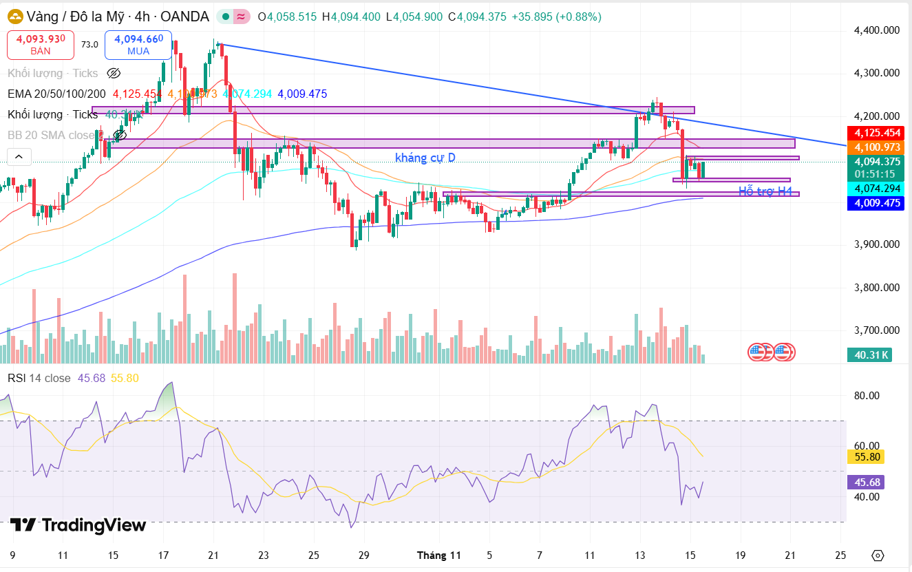 Với góc nhìn dài hạn, cứ trượt mạnh vào hôm thứ sau tuần vừa rồi (tức 14/11) đã phá vỡ nhịp phục hồi của giá vàng kể từ khi chỉ số đạt đỉnh hồi tháng 10. Hiện tại, chỉ số XAU/USD đang được neo ở mức 4091 và ghi nhận giảm hơn 20 đô la/ounce so với phiên trước đó. Đa phần các chỉ báo kĩ thuật đang ủng hộ cho đà giảm dài hạn khi mẫu hình 2 đỉnh (double top) đã được hình thành ở cả khung ngày và H4. Tuy nhiên, vị trí và độ giãn của các đường EMA ngắn hạn (EMA 20-50) đang cho thấy phe bán chưa hoàn toàn chiếm ưu thế cũng như đường trendline đi xuống chưa có đủ điểm xác nhận, vậy nên vẫn còn quá sớm để có thể khẳng định vào lúc này.