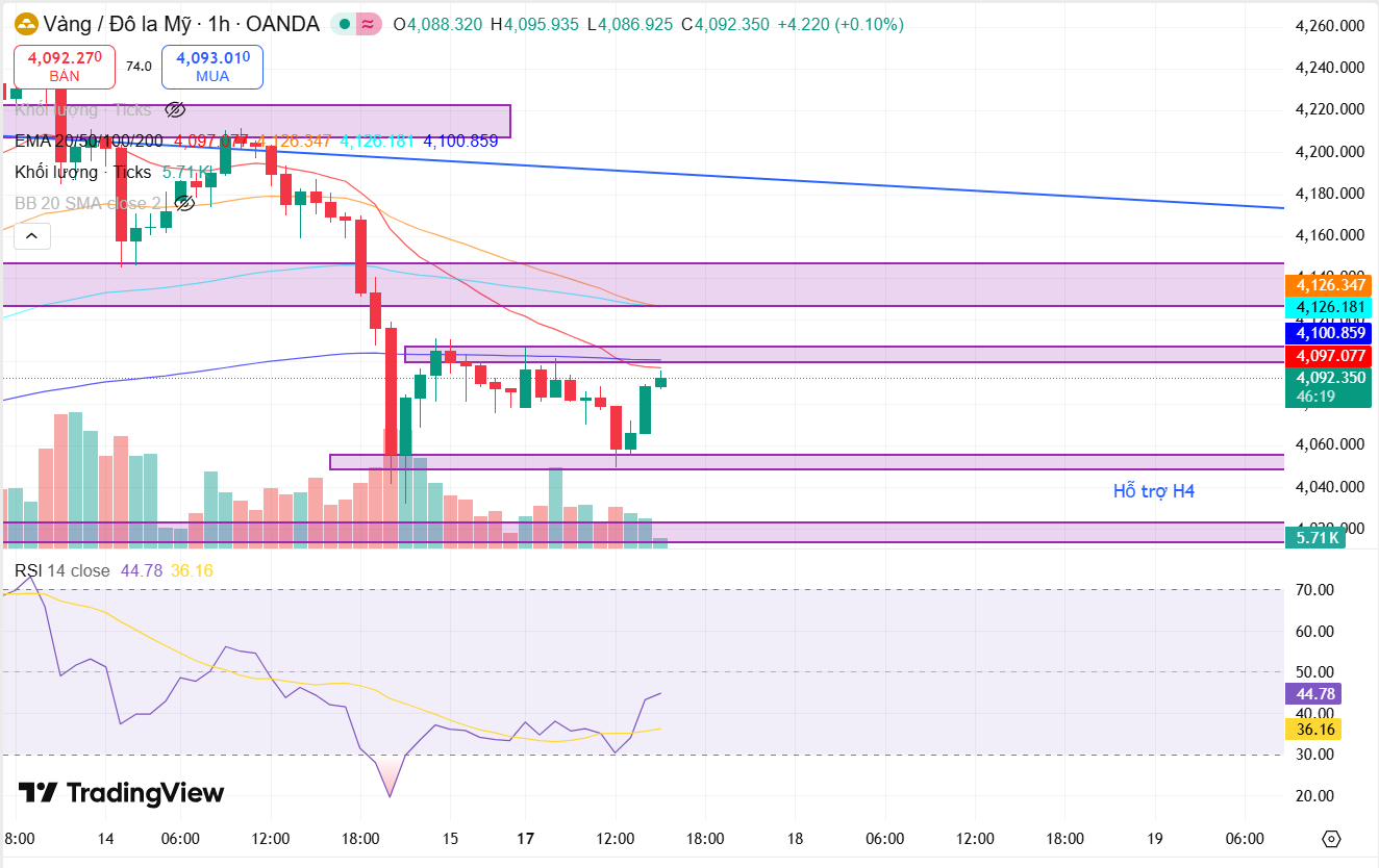 Để đánh giá cơ hội giao dịch trong ngày, hãy cùng phân tích khung giá H1. Hiện tại, thị trường đang tích lũy và do dự sau một đợt bán tháo nhẹ. Giá đang nằm dưới các đường trung bình động, củng cố xu hướng giảm ngắn hạn. Tuy nhiên, lực bán đã chững lại khi giá dao động trong phạm vi hẹp giữa hỗ trợ ngắn hạn $4,050 và kháng cự $4,100. Đáng chú ý, chỉ báo RSI đã có sự phục hồi mạnh mẽ từ vùng quá bán và đang hướng lên, báo hiệu động lượng tăng trong ngắn hạn có thể đang quay trở lại. Điểm mấu chốt để xác định xu hướng tiếp theo là hành động giá tại vùng kháng cự $4,097 - $4,100. Nếu giá phá vỡ và duy trì trên mức này, thị trường có thể kiểm tra lại vùng kháng cự mạnh hơn tại $4,126. Ngược lại, nếu giá không thể vượt qua và quay đầu giảm dưới $4,050, áp lực bán sẽ tái diễn, đẩy giá về mức hỗ trợ H4 quan trọng quanh $4,010.