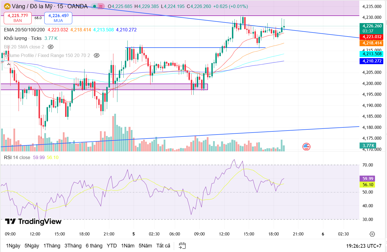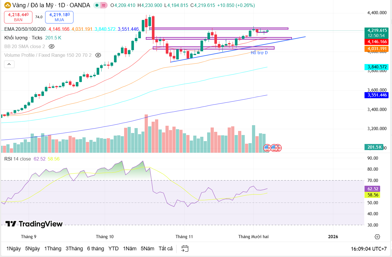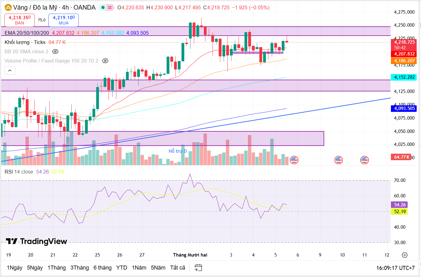 Chuyển sang khung thời gian 4 giờ, thị trường đang trong trạng thái tích lũy sau nhịp tăng hồi đầu tuần. Hành động giá hiện tại đang bám sát đường EMA 20, phản ánh sự lưỡng lự của cả phe mua và phe bán trước thời điểm tin ra. Đáng chú ý, đường EMA 50 đang đóng vai trò là mức hỗ trợ động tại vùng giá 4.186. Chỉ báo RSI trên khung H4 đang đi ngang quanh mốc 54, thể hiện trạng thái trung tính. Mẫu hình nến gần đây cho thấy sự thu hẹp biên độ, cho thấy tiềm năng của một đợt đột phá mạnh.