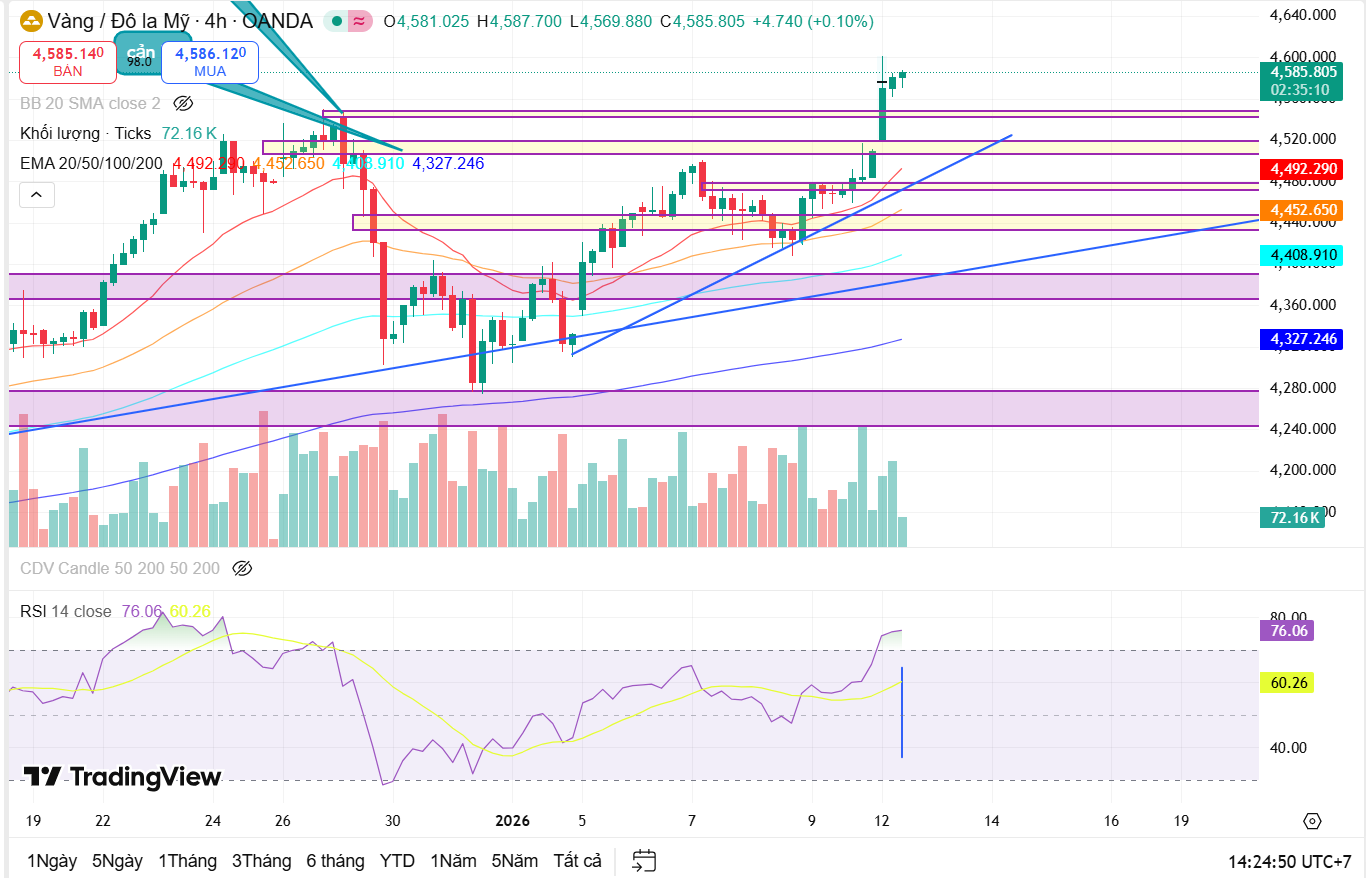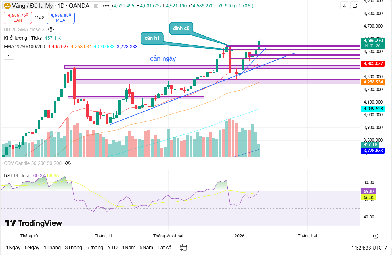 Trên khung ngày, xu hướng tăng trung hạn của vàng vẫn được giữ vững rõ ràng. Giá hình thành cấu trúc đỉnh – đáy sau cao hơn, đồng thời duy trì vận động phía trên các đường EMA quan trọng (EMA20/50/100/200). Việc giá bứt lên khỏi vùng cản ngày và đỉnh cũ cho thấy lực mua đang chiếm ưu thế, đặc biệt trong bối cảnh động lực đến từ yếu tố địa chính trị. RSI ngày duy trì quanh vùng cao nhưng chưa xuất hiện phân kỳ giảm rõ ràng, hàm ý đà tăng vẫn còn dư địa, dù rủi ro điều chỉnh kỹ thuật có thể xuất hiện khi giá đi xa khỏi vùng cân bằng.