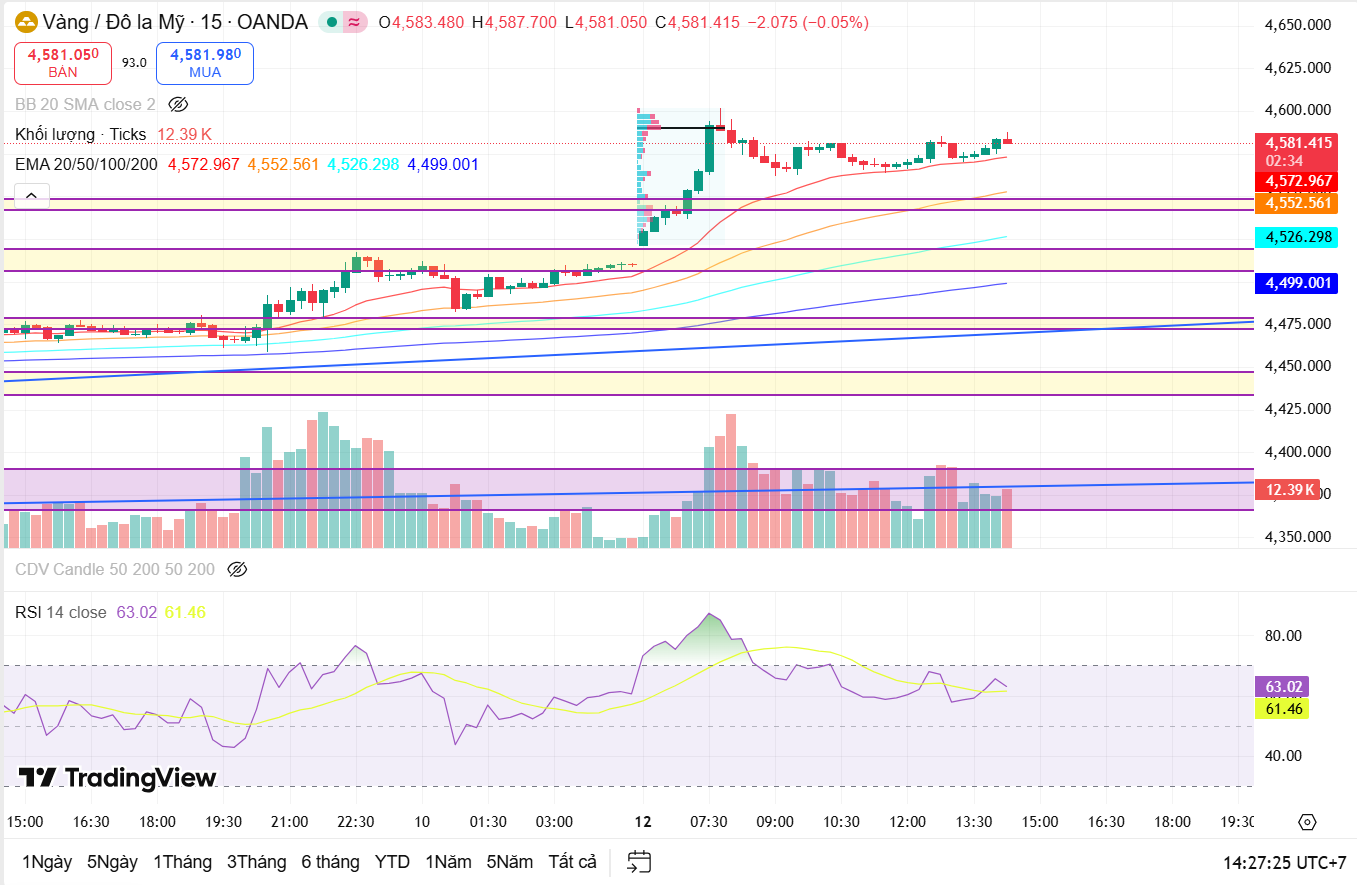 Ở khung M15, thị trường thể hiện trạng thái tích lũy đi ngang sau cú tăng mạnh, với biên độ dao động thu hẹp dần. Giá di chuyển quanh EMA20–EMA50, phản ánh sự giằng co ngắn hạn giữa bên mua và bên bán. RSI M15 hạ nhiệt về vùng trung tính cao, cho thấy áp lực chốt lời đã xuất hiện nhưng chưa đủ lớn để phá vỡ cấu trúc tăng. Đây là khung thời gian phù hợp để theo dõi phản ứng giá tại các vùng hỗ trợ gần nhằm đánh giá khả năng tiếp diễn xu hướng.
