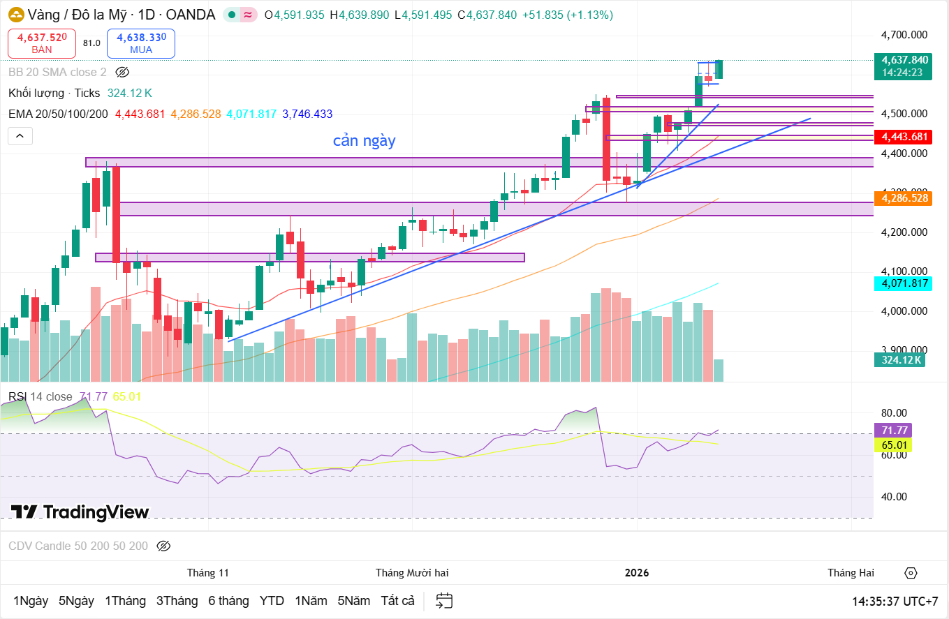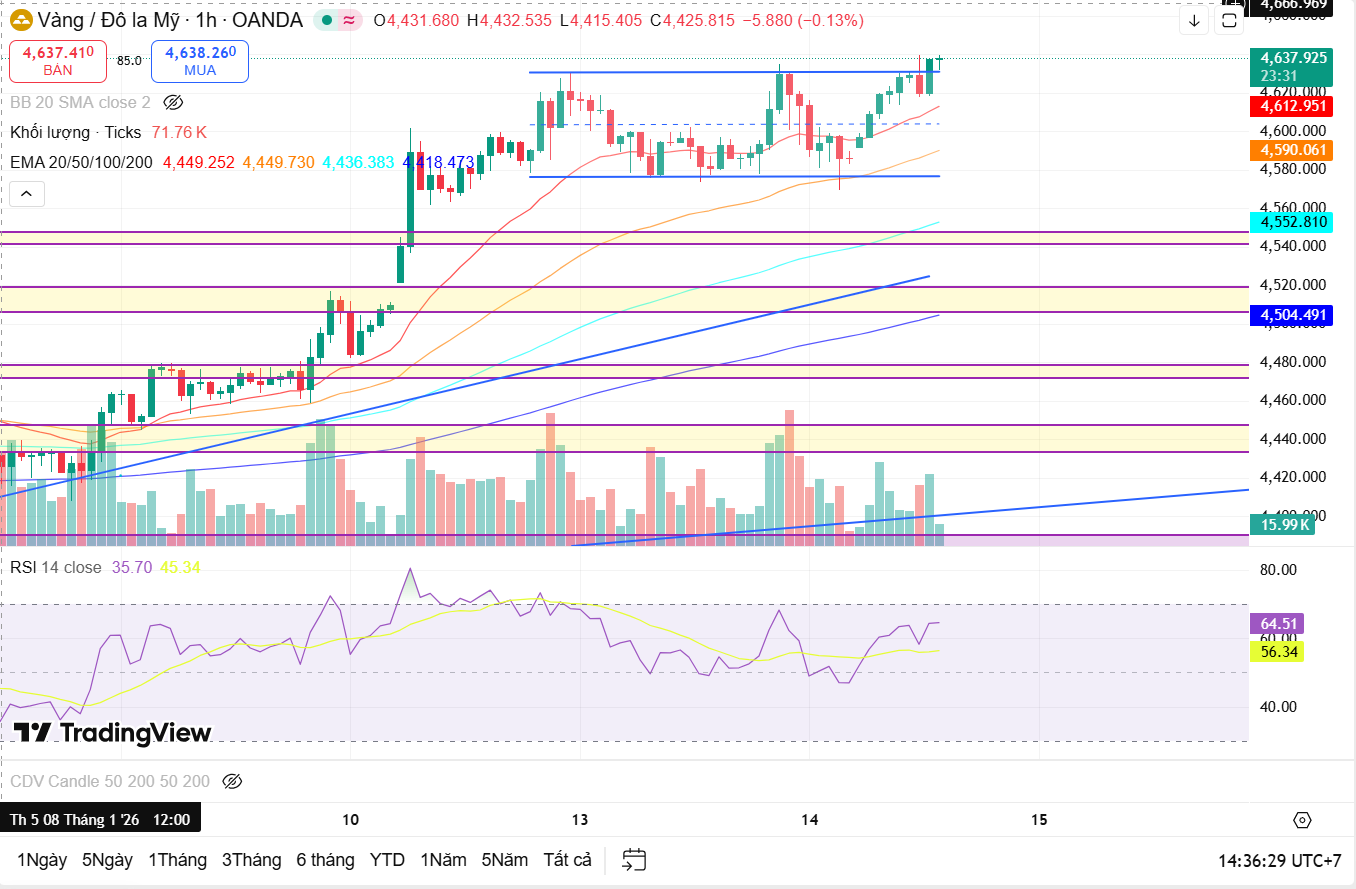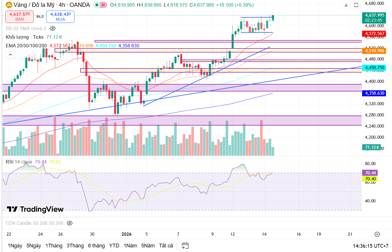 Trên H4, cấu trúc tăng trung hạn được bảo toàn tốt. Sau nhịp tăng mạnh, giá đang đi ngang tích lũy phía trên vùng hỗ trợ mới hình thành quanh khu vực 4,60xx. Các nhịp điều chỉnh đều có biên độ tương đối nhỏ và chưa phá vỡ các đáy quan trọng, cho thấy phe mua vẫn đang kiểm soát cấu trúc chính.