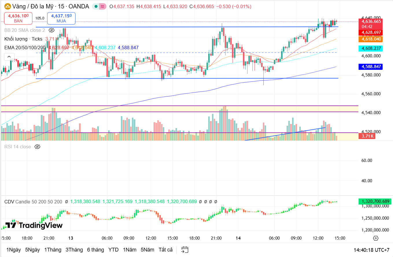 Ở M15, cấu trúc giá cho thấy các đáy sau cao dần, dù xuất hiện rung lắc intraday. RSI M15 không duy trì quá lâu trong vùng quá mua, phản ánh thị trường đang hấp thụ lực chốt lời ngắn hạn thay vì phân phối mạnh.