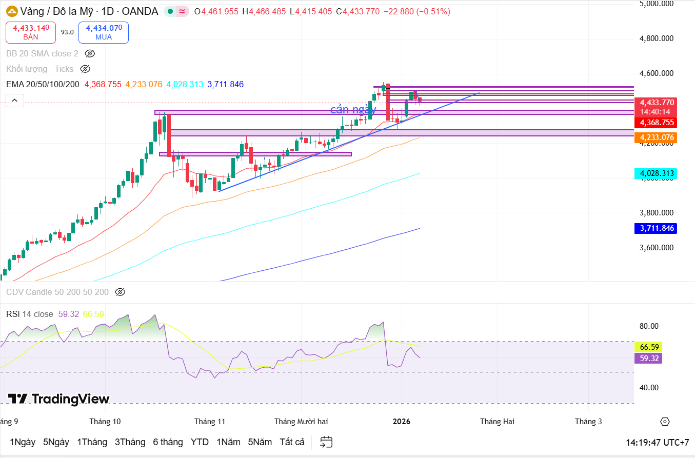 Trên khung ngày, cấu trúc tăng trung – dài hạn chưa bị phá vỡ, tuy nhiên giá đang bước vào pha điều chỉnh rõ ràng sau nhịp tăng mạnh trước đó. Nến ngày gần nhất cho thấy áp lực chốt lời xuất hiện quanh vùng đỉnh, khiến giá đóng cửa thấp hơn đáng kể so với đỉnh trong ngày.