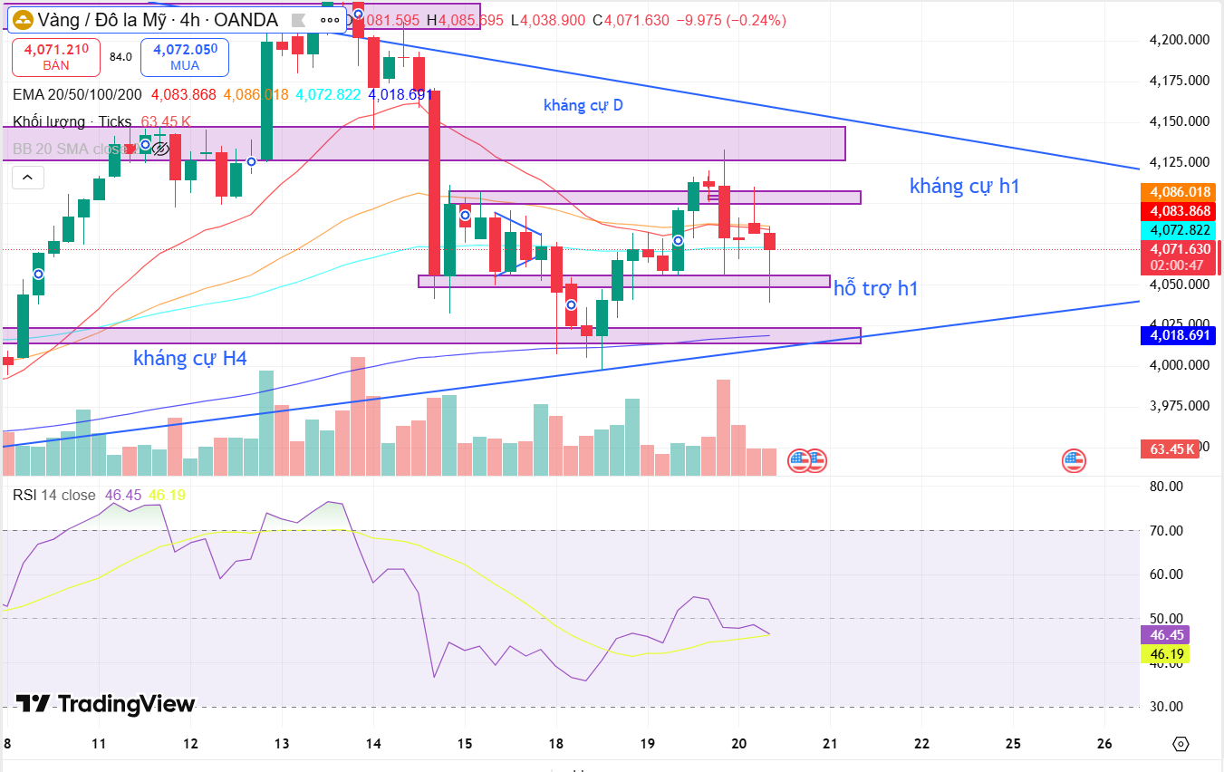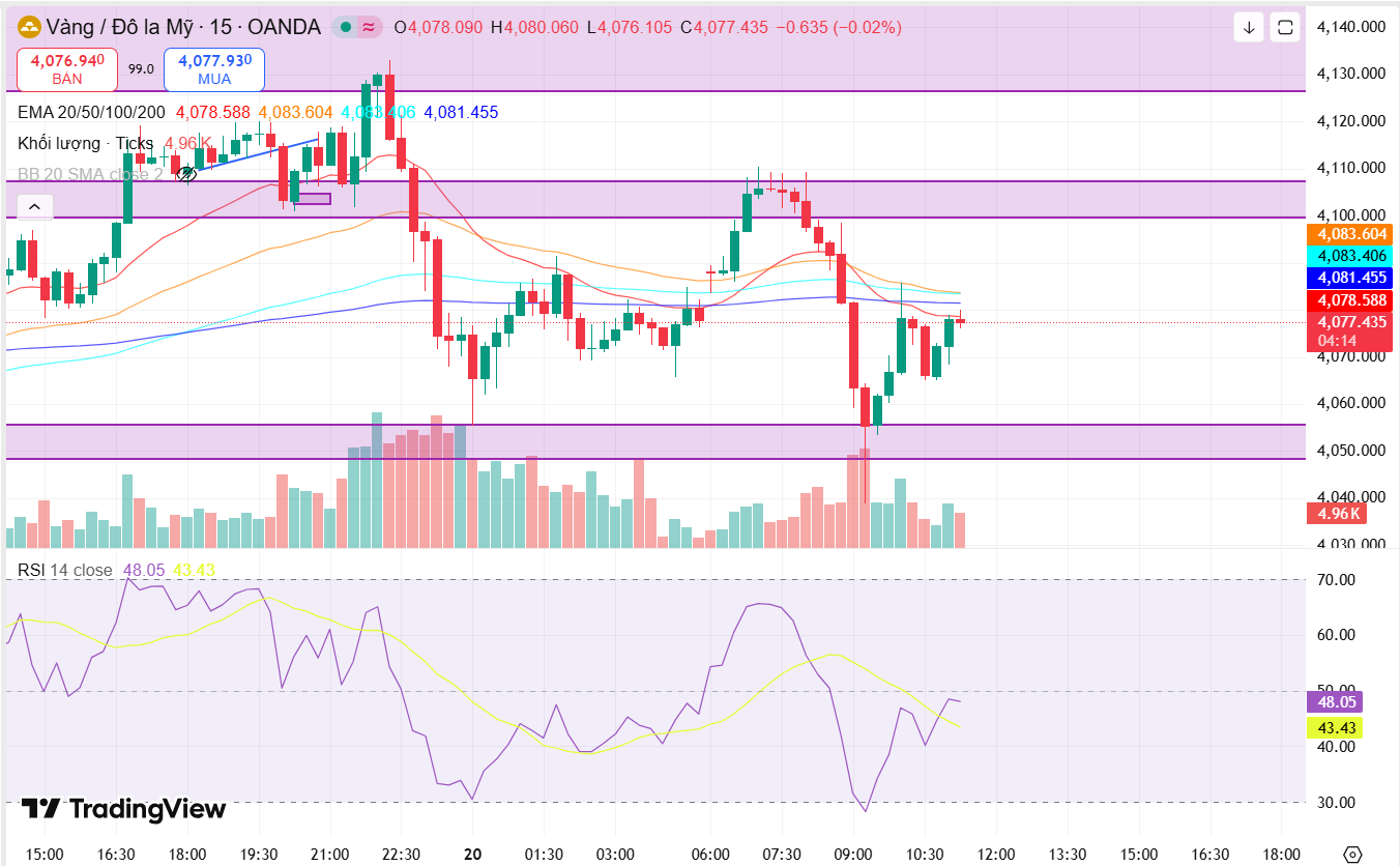 Chi tiết hơn ở khung M15, hệ thống EMA đang đóng vai trò là kháng cự động rất cứng. Giá hiện vẫn bị kìm hãm dưới dải EMA ngắn và trung hạn (vùng 4.078 - 4.083 USD). Yếu độ động lương cũng không ủng hộ đà tăng khi chỉ số RSI vẫn đang giằng co quanh vùng trung vị (~48). Việc phe mua chưa thể đẩy giá bứt phá dứt khoát khỏi vùng cản này cho thấy nỗ lực hồi phục vẫn còn khá mong manh và thiếu tính bền vững.