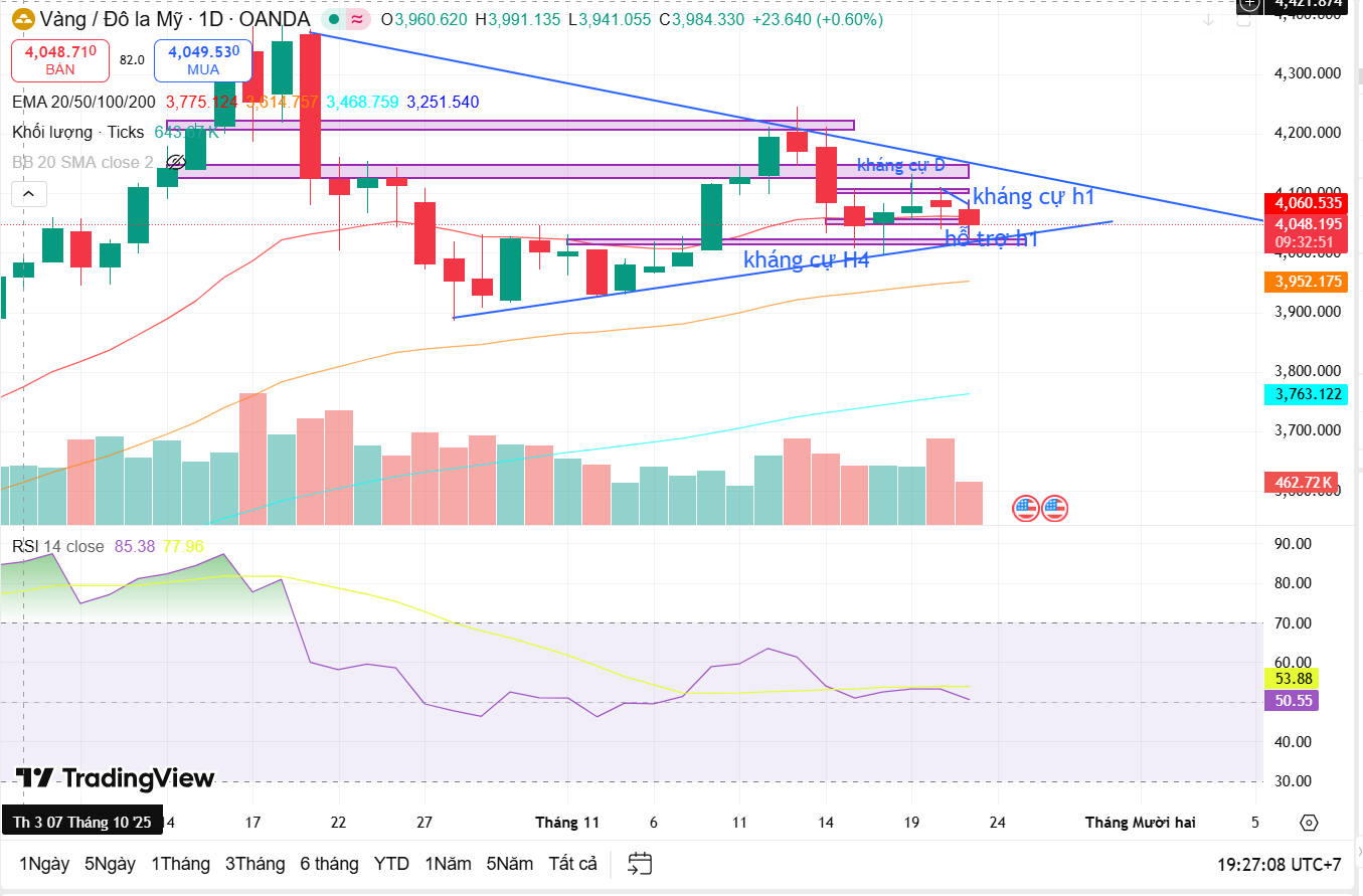 Khi quan sát bức tranh toàn cảnh của thị trường trên khung thời gian Ngày (D1), chúng ta có thể thấy rõ ràng Vàng đang nằm trong một giai đoạn tích lũy kéo dài với biên độ dao động ngày càng thu hẹp, hình thành nên mô hình Tam giác cân (Symmetrical Triangle) điển hình. Vị trí giá hiện tại đang bị kẹt ở vùng trung tâm của mô hình này, đồng thời nằm dưới áp lực của chùm dây trung bình động (EMA), kết hợp với chỉ báo RSI (14) đi ngang quanh mốc 50, cho thấy tâm lý lưỡng lự và sự cân bằng tạm thời giữa phe Mua và phe Bán về mặt dài hạn. Tuy nhiên, sự cân bằng này đang dần bị phá vỡ khi chúng ta đi sâu vào các khung thời gian nhỏ hơn.