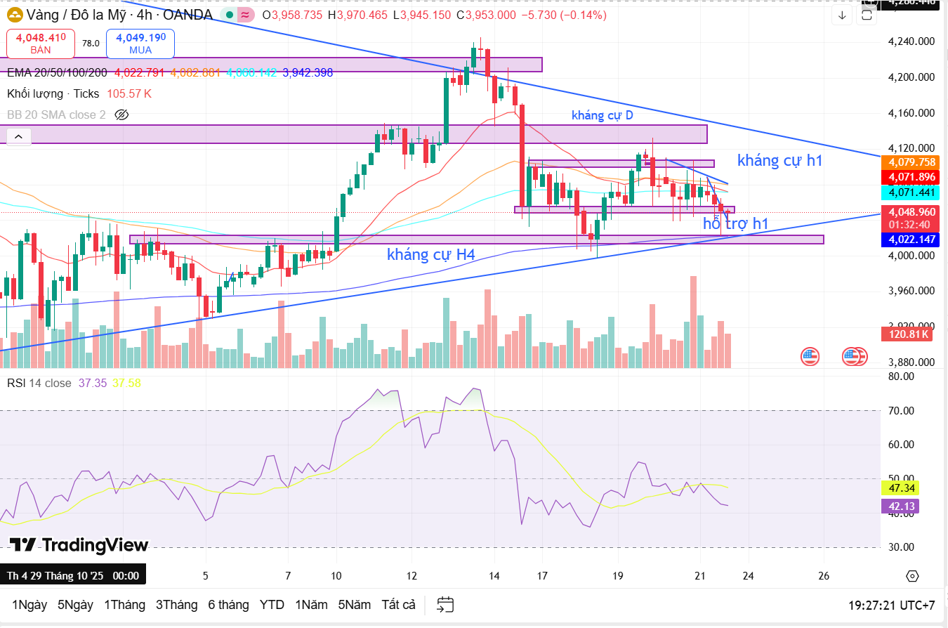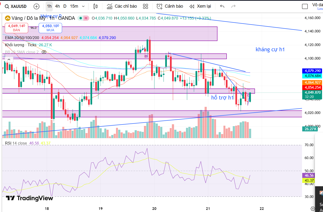 Cụ thể, trên khung trung hạn 4 Giờ (H4) và ngắn hạn 1 Giờ (H1), cấu trúc thị trường đang nghiêng hẳn về xu hướng giảm (Bearish). Giá liên tục tạo ra các đỉnh sau thấp hơn đỉnh trước và tôn trọng tuyệt đối đường xu hướng giảm (Downtrend line) nối các đỉnh gần nhất. Hiện tại, giá đang bị ép sát xuống vùng hỗ trợ quan trọng ngắn hạn (được đánh dấu là 'hỗ trợ h1' và 'hố trợ h1' trên biểu đồ) quanh mốc 4.048 - 4.050. Đây có thể coi là 'chốt chặn' cuối cùng của phe Mua trong ngắn hạn. Mặc dù chỉ báo RSI trên H4 đã giảm về mức 37.35 – tiệm cận vùng quá bán (Oversold) – gợi ý rằng động lượng bán có thể đang yếu đi đôi chút, nhưng trên biểu đồ giá vẫn chưa xuất hiện bất kỳ tín hiệu đảo chiều mạnh mẽ nào như mô hình hai đáy hay nến Bullish Engulfing xác nhận.