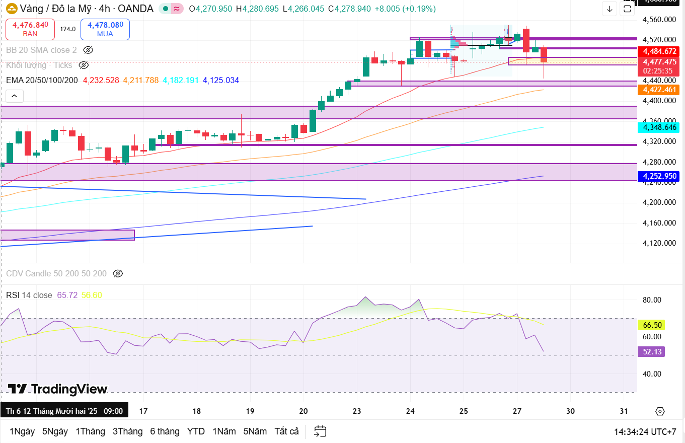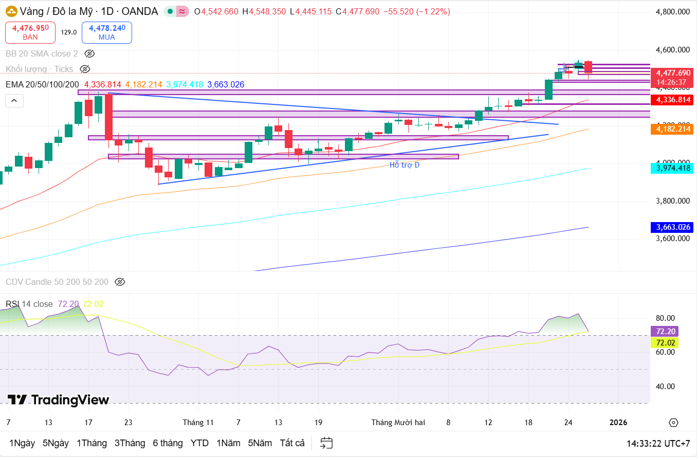 Trên khung ngày, XAUUSD vẫn duy trì xu hướng tăng trung hạn khi giá nằm trên hệ thống EMA quan trọng (EMA50 – EMA100 – EMA200), cấu trúc đáy sau cao hơn đáy trước vẫn chưa bị phá vỡ. Tuy nhiên, sau nhịp tăng mạnh lên vùng đỉnh gần 4,550, giá đã bắt đầu bước vào pha điều chỉnh kỹ thuật. RSI khung ngày đang ở vùng cao và có dấu hiệu hạ nhiệt, cho thấy động lực tăng đang chậm lại, nhường chỗ cho giai đoạn tích lũy hoặc điều chỉnh lành mạnh trước khi xác định xu hướng tiếp theo.