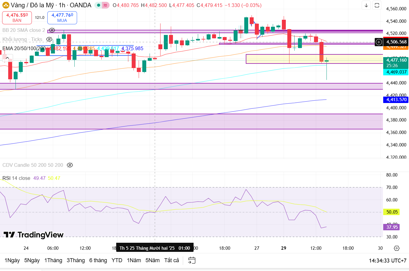 Ở khung H1, cấu trúc giảm được thể hiện khá rõ khi giá liên tục tạo đỉnh thấp hơn, đồng thời bị từ chối tại các vùng kháng cự intraday. Nhịp giảm mạnh gần nhất đi kèm thân nến lớn cho thấy áp lực bán chủ động từ dòng tiền ngắn hạn, không chỉ đơn thuần là điều chỉnh kỹ thuật nhẹ. RSI H1 rơi xuống dưới vùng cân bằng 50 và chưa có tín hiệu phân kỳ rõ ràng, hàm ý phe bán vẫn đang kiểm soát nhịp vận động hiện tại.