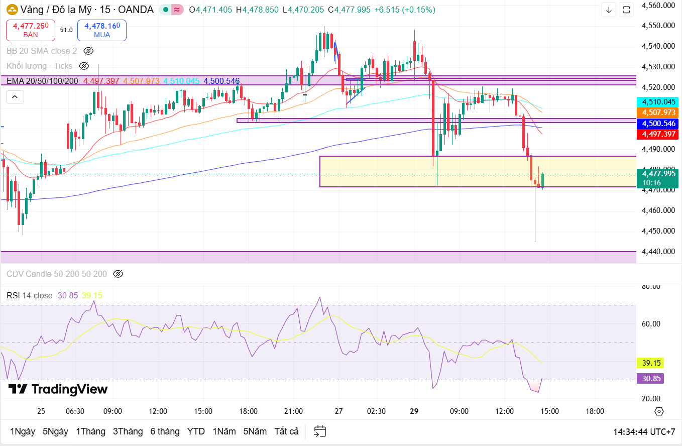 Trên khung M15, giá đang phản ứng tại vùng hỗ trợ ngắn hạn – nơi từng xuất hiện lực mua trước đó. Sau cú quét thanh khoản xuống dưới, thị trường có dấu hiệu chậm lại và xuất hiện nến hồi nhẹ. Tuy nhiên, RSI M15 vẫn nằm trong vùng thấp, cho thấy nhịp hồi (nếu có) nhiều khả năng chỉ mang tính hồi kỹ thuật thay vì đảo chiều xu hướng. Trong bối cảnh thiếu tin tức, các nhịp bật lên khung nhỏ cần được đánh giá cẩn trọng và ưu tiên quan sát phản ứng giá tại các vùng kháng cự gần.