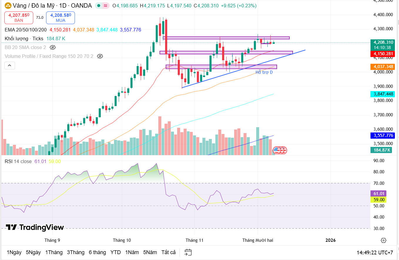 Trên khung thời gian Ngày (D1), xu hướng tổng thể của XAUUSD vẫn là tăng trưởng mạnh mẽ. Giá đang củng cố trong một kênh xu hướng tăng hình thành từ tháng 9, với các mức đáy cao hơn được duy trì. Hiện tại, giá vàng đang dao động ngay dưới đỉnh lịch sử gần nhất, được hỗ trợ bởi đường xu hướng tăng (Trendline) và đường EMA 50/100. Vùng hỗ trợ kỹ thuật mạnh mẽ và quan trọng nhất được xác định tại khu vực 4,000-4,050, vùng hỗ trợ có Volume Profile cao nhất trong 2 tháng gần đây. Chỉ số RSI cũng đang duy trì ở mức trên 50 (khoảng 61.01), xác nhận động lượng mua vẫn đang chiếm ưu thế mặc dù đã giảm nhiệt so với đỉnh. Đây là tín hiệu cho thấy các nhà đầu tư dài hạn vẫn đang nắm giữ vị thế.