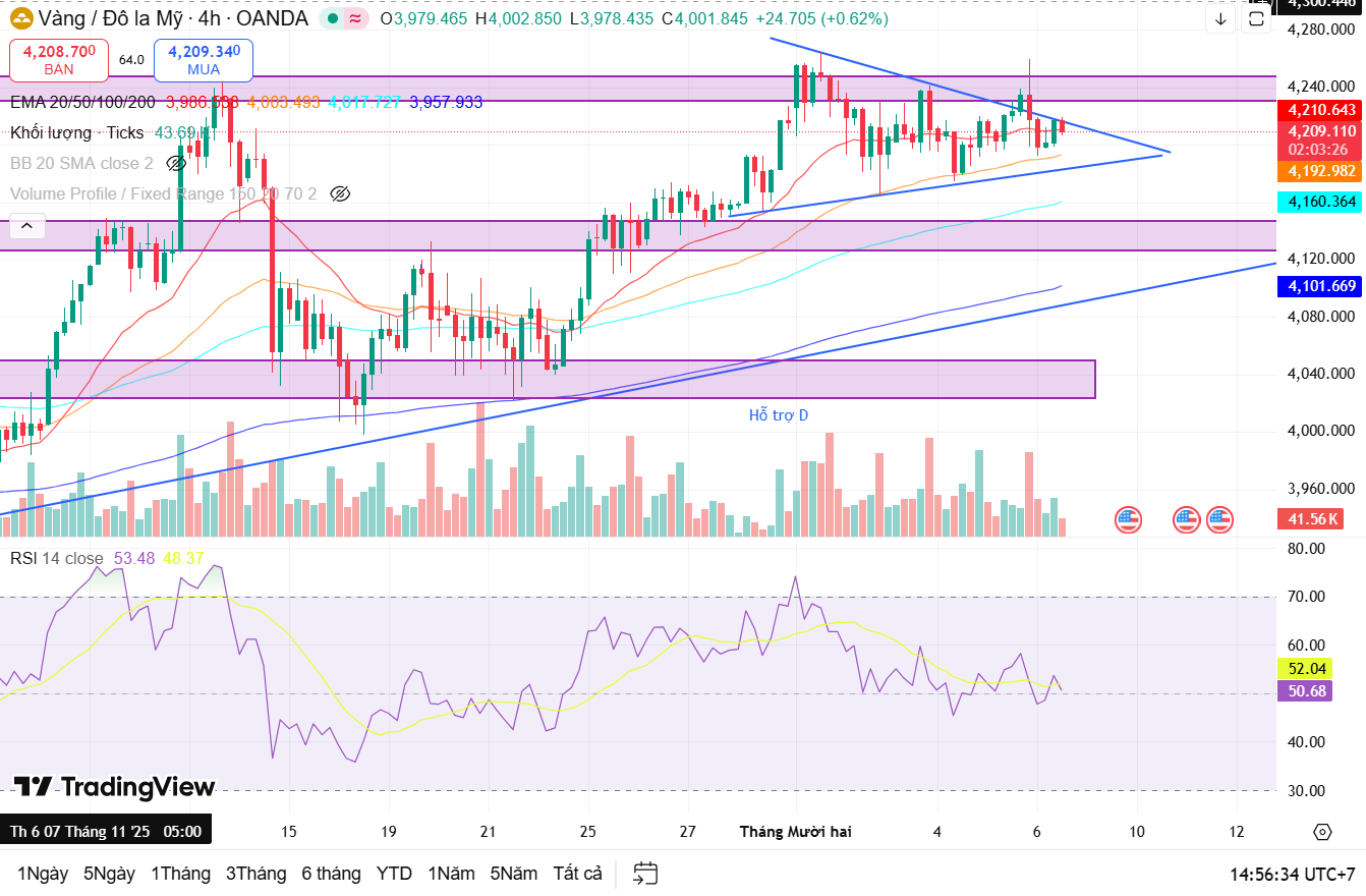 Chuyển sang khung H4, XAUUSD đang hình thành mẫu hình tam giác cân, và vận động giá đang đi đến hồi kết của mẫu hình - báo hiệu một đợt bứt phá mạnh mẽ. Vùng kháng cự chính mà giá cần phá vỡ nằm tại khu vực 4,240 - 4,260/ounce. Nếu thật bại, nhiều khả năng chỉ số sẽ quay đâu về kiểm định vùng hỗ trợ quanh 4,180 trước khi đi vào xu hướng rõ ràng.