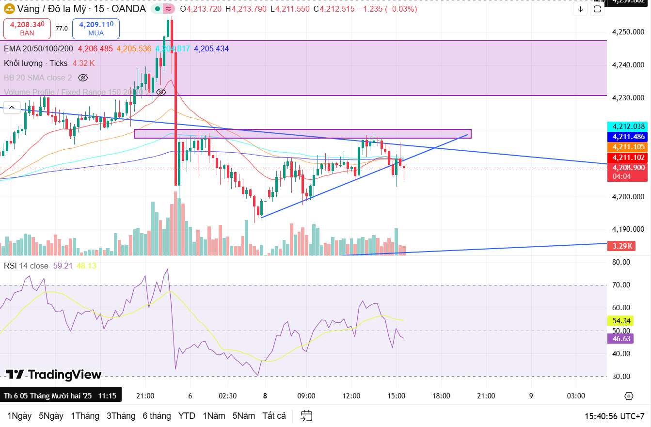 Trên khung H1 và M15, XAUUSD đang cho thấy xu hướng dao động trong biên độ hẹp và chịu áp lực giảm nhẹ từ cuối tuần trước. Giá trên khung H1 đã điều chỉnh sau khi không thể duy trì trên vùng kháng cự mạnh 4,240 - 4,260 và hiện đang nằm dưới các đường EMA ngắn hạn (20-50).