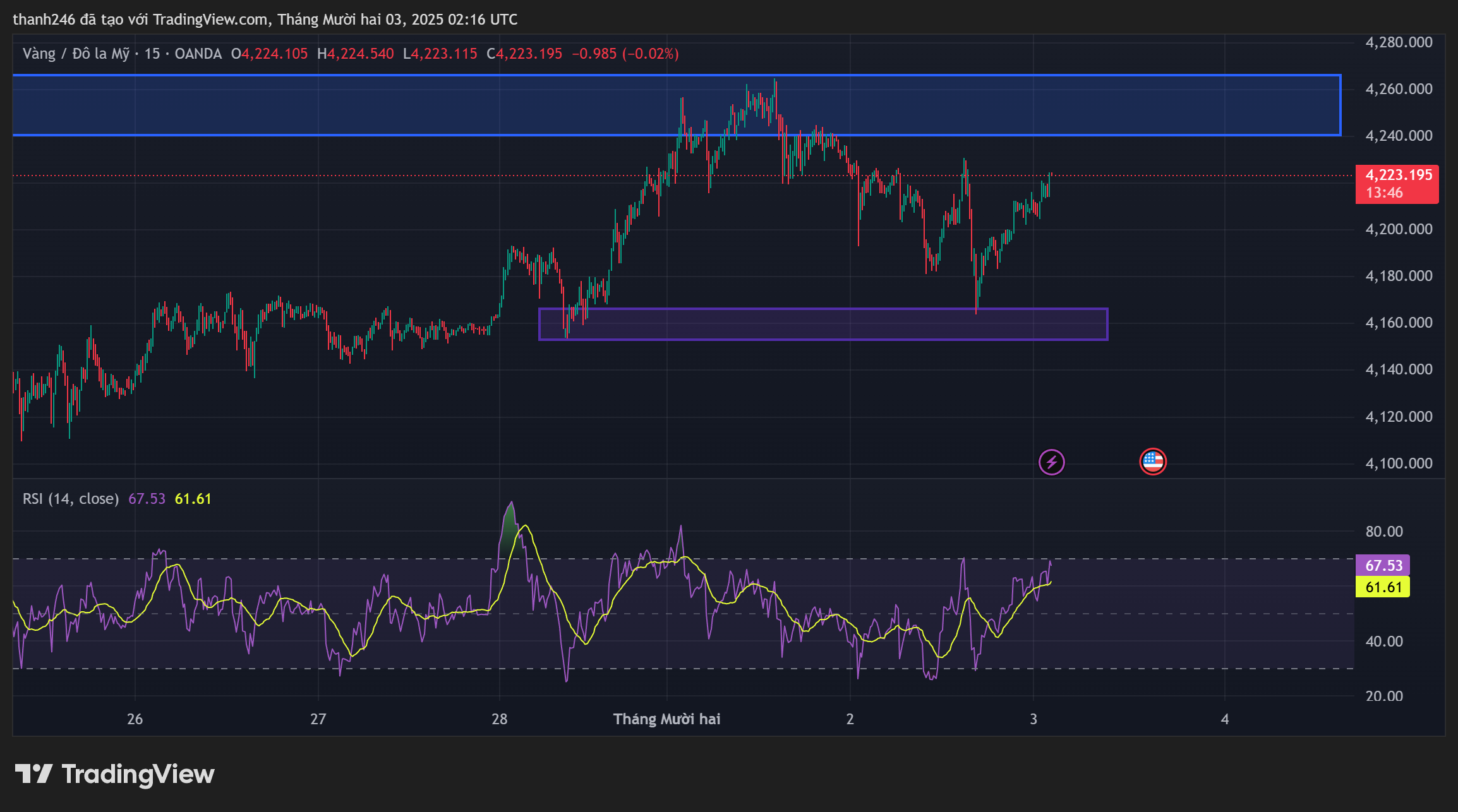 - Vùng Hỗ trợ: Được củng cố quanh mức 4,150 - 4,170 (khung M15 và M30). Đây là khu vực mà giá đã tạo đáy và bật lên mạnh mẽ trong các phiên gần đây, giữ vai trò là nền tảng cho xu hướng tăng hiện tại.
