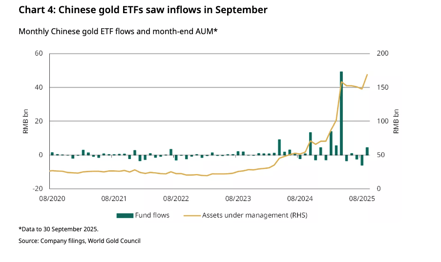 Với dòng vàng đổ vào tích cực trong tháng 9 cùng với giá tăng vọt, tài sản được quản lý (AUM) của ETF vàng Trung Quốc đã tăng lên mức đỉnh điểm vào cuối tháng là 169 tỷ Yên (22 tỷ USD).