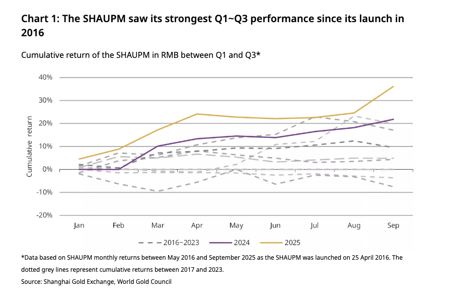 Giá vàng nội địa Trung Quốc cũng theo xu hướng tương tự. Chỉ số Giá Vàng Chuẩn Thượng Hải (SHAUPM) đã tăng 36% trong chín tháng đầu năm 2025, đánh dấu năm tốt nhất từ trước đến nay. SHAUPM đã lập kỷ lục mới 36 lần trong ba quý đầu năm, và giá vàng Thượng Hải đã đạt tháng tốt nhất từ trước đến nay vào tháng 9.
