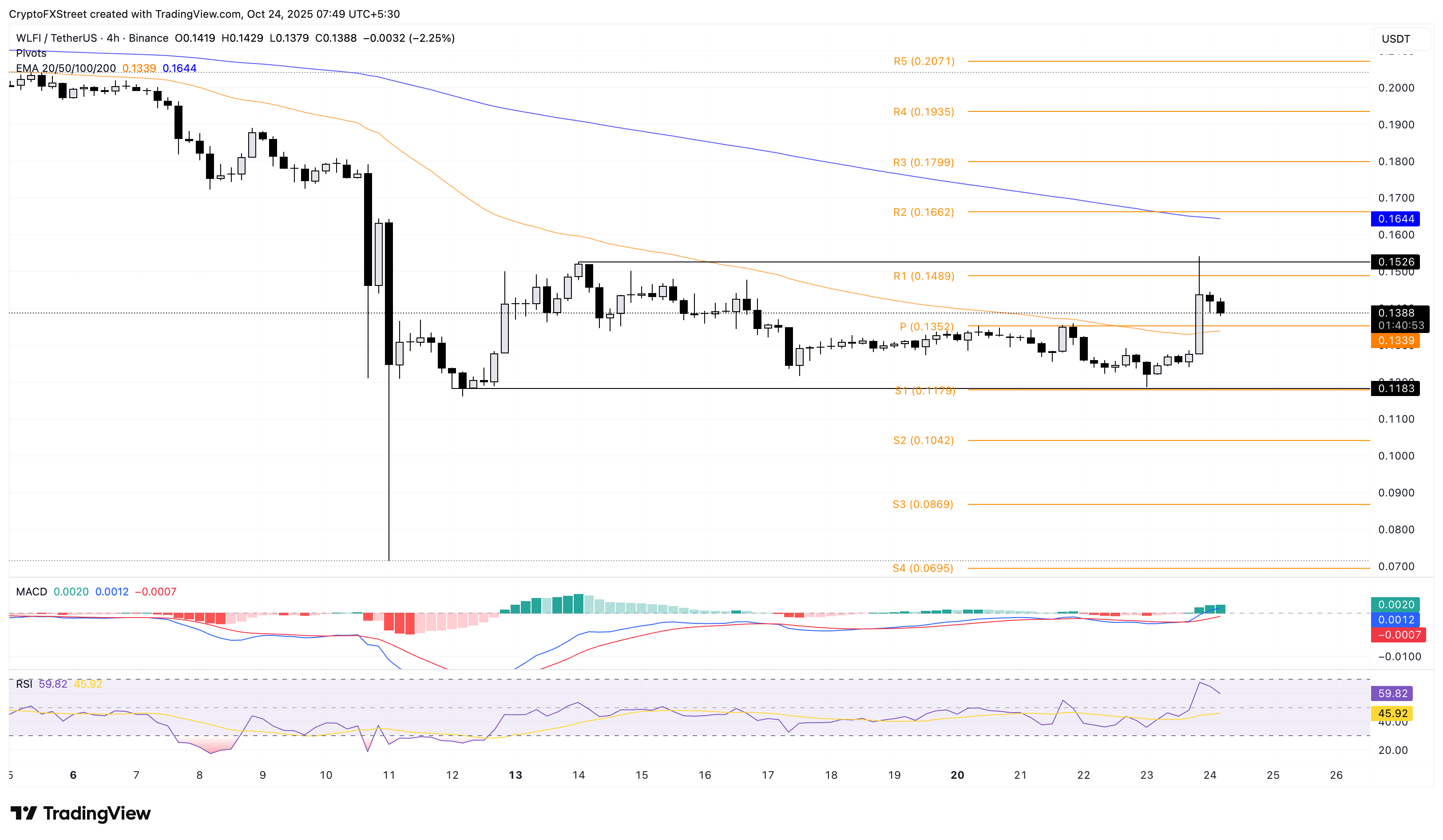 World Liberty Financial giữ vững trên mức 0,1350 đô la vào thời điểm viết bài hôm thứ Sáu, sau khi tăng 16% vào ngày hôm trước. Token WLFI đang giao dịch trong phạm vi đi ngang giữa mức cơ sở 0,1183 đô la và mức trần 0,1526 đô la trên biểu đồ 4 giờ.