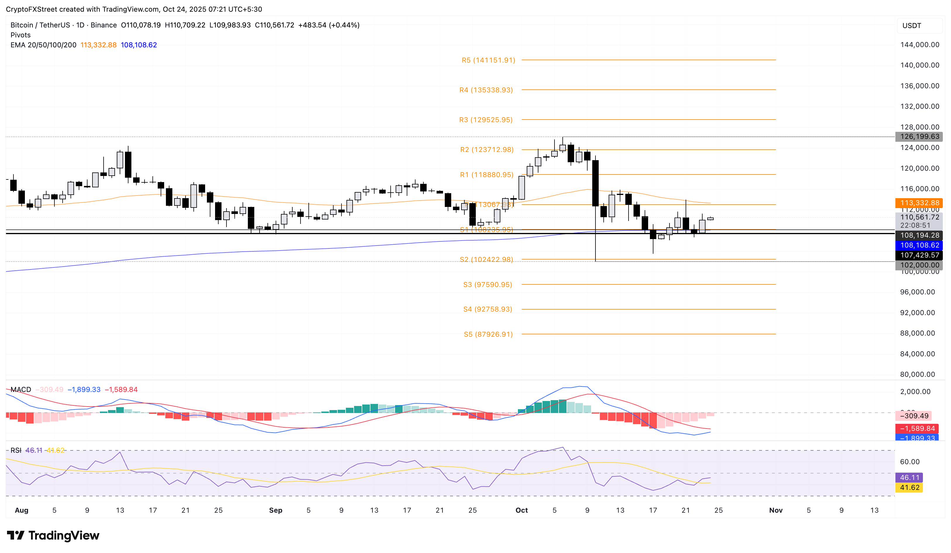 Bitcoin đang giao dịch trên mức 110.000 đô la vào thời điểm viết bài hôm thứ Sáu, sau khi tăng 2% vào ngày hôm trước. Sự phục hồi của Bitcoin có thể gặp phải ngưỡng kháng cự tại Đường trung bình động hàm mũ 50 ngày ở mức 113.334 đô la, trùng khớp với Điểm xoay trung tâm.