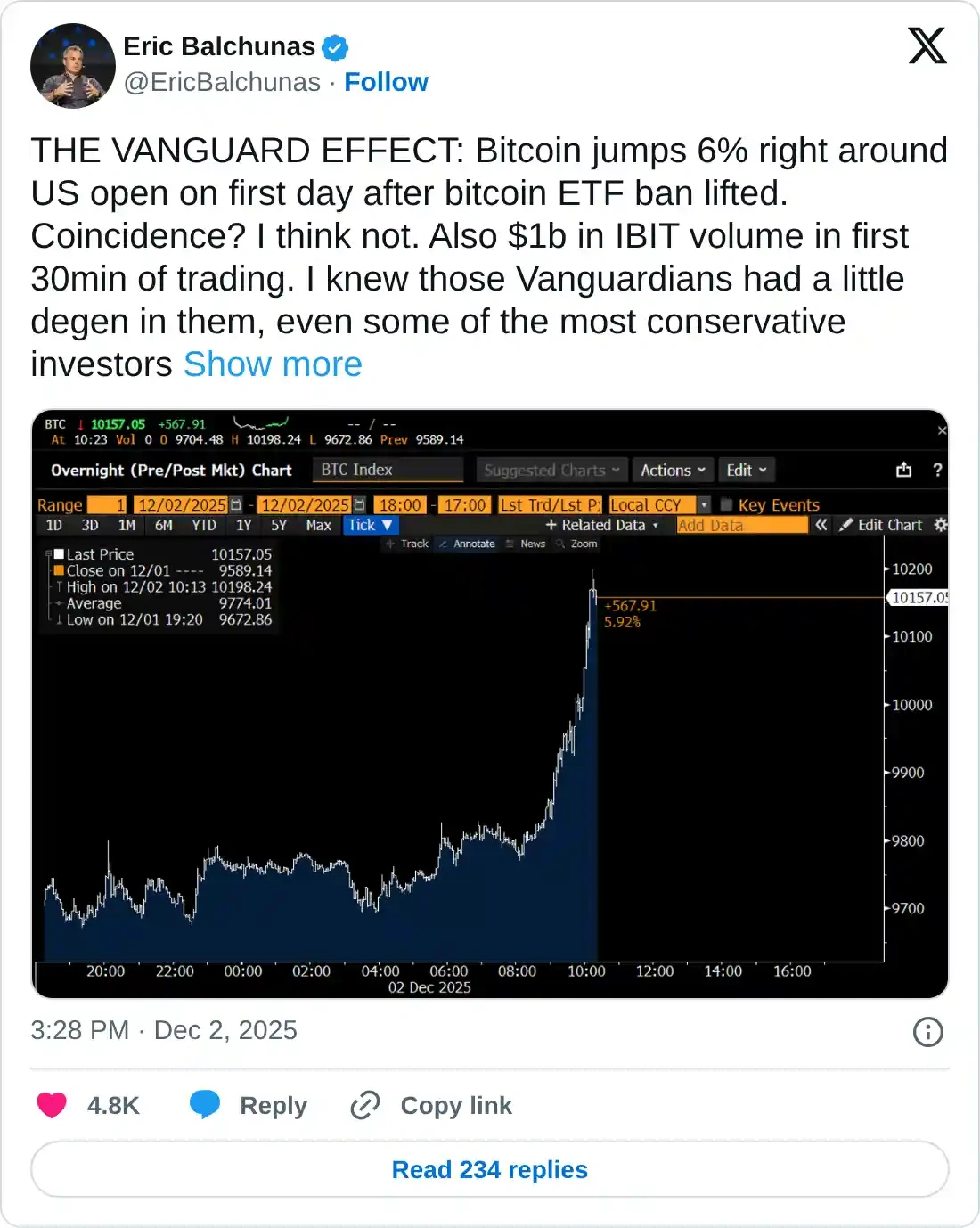 Vanguard, một công ty quản lý tài sản có trụ sở tại Hoa Kỳ với hơn 11 nghìn tỷ đô la tài sản đang quản lý, đã công bố vào thứ Ba rằng họ sẽ cho phép các quỹ ETF Bitcoin hoạt động trên nền tảng của mình, dẫn đến sự phục hồi mạnh mẽ của giá BTC. Theo Eric Balchunas, nhà phân tích ETF của Bloomberg, khối lượng giao dịch IBIT của BlackRock đã đạt hơn 1 tỷ đô la trong 30 phút đầu tiên của phiên giao dịch, cho thấy nhu cầu của các tổ chức đã được phục hồi.