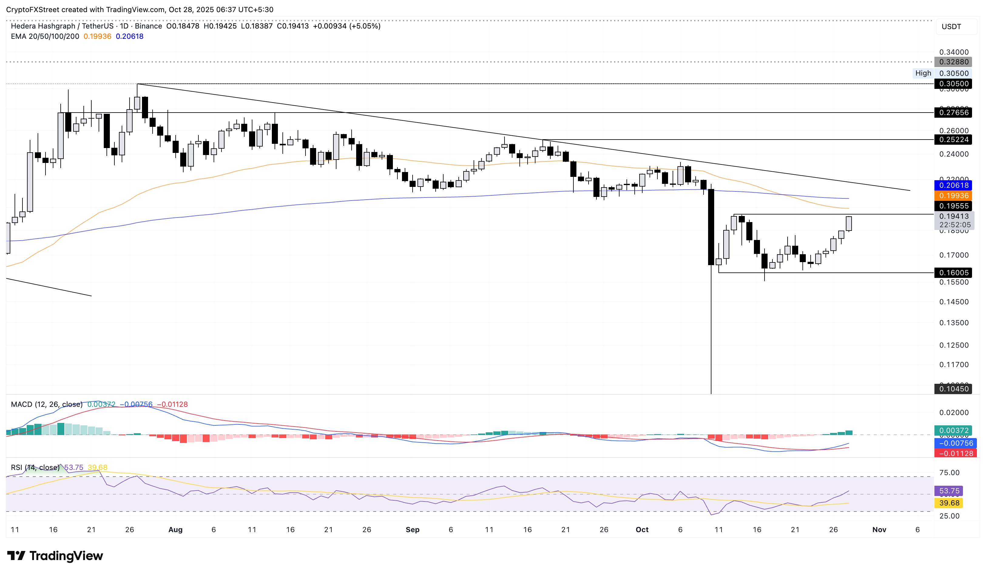 Đường hồi phục của Hedera đang tiến gần đến ngưỡng kháng cự 0,1955 đô la, được đánh dấu bằng mức cao nhất vào ngày 13 tháng 10. Nếu HBAR đóng cửa trên mức này, nó có thể nhắm đến đường xu hướng kháng cự trên biểu đồ hàng ngày, được hình thành bằng cách nối các đỉnh từ ngày 27 tháng 7 đến ngày 18 tháng 9, gần 0,2170 đô la.