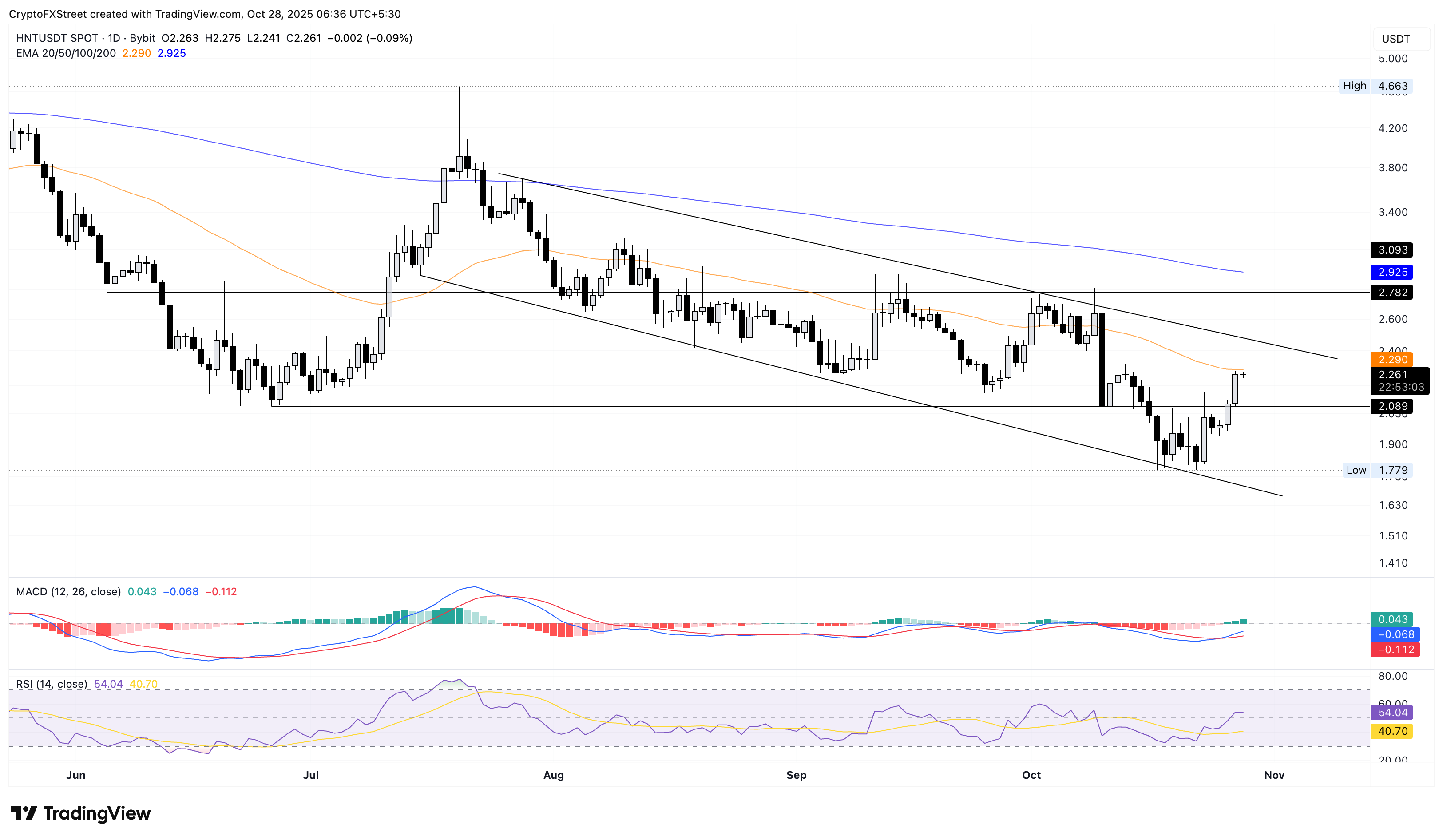 Helium đang giao dịch trên mức 2,250 đô la tại thời điểm viết bài vào thứ Ba, giữ vững sau mức tăng 7,66% của ngày hôm trước. Tương tự TRUMP, token Mạng lưới Cơ sở hạ tầng Vật lý Phi tập trung (DePIN) đang gặp phải ngưỡng kháng cự từ đường EMA 50 ngày ở mức 2,290 đô la, trong mô hình kênh giảm.