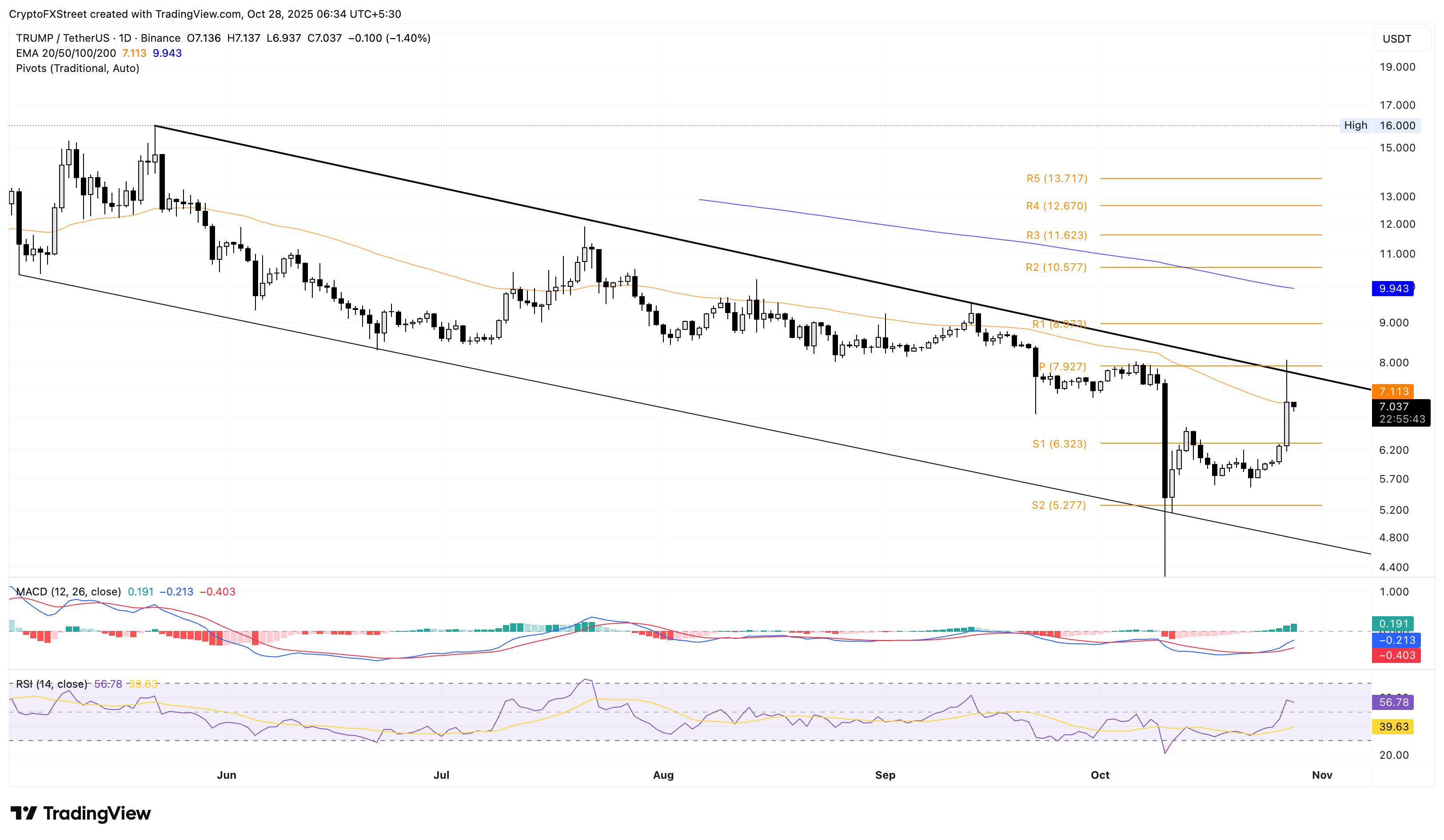 Giá token chính thức của Trump đã giảm hơn 1% vào thời điểm viết bài hôm thứ Ba, sau mức tăng 13% của thứ Hai. Token TRUMP đang chật vật vượt qua đường trung bình động hàm mũ (EMA) 50 ngày ở mức 7,113 đô la.