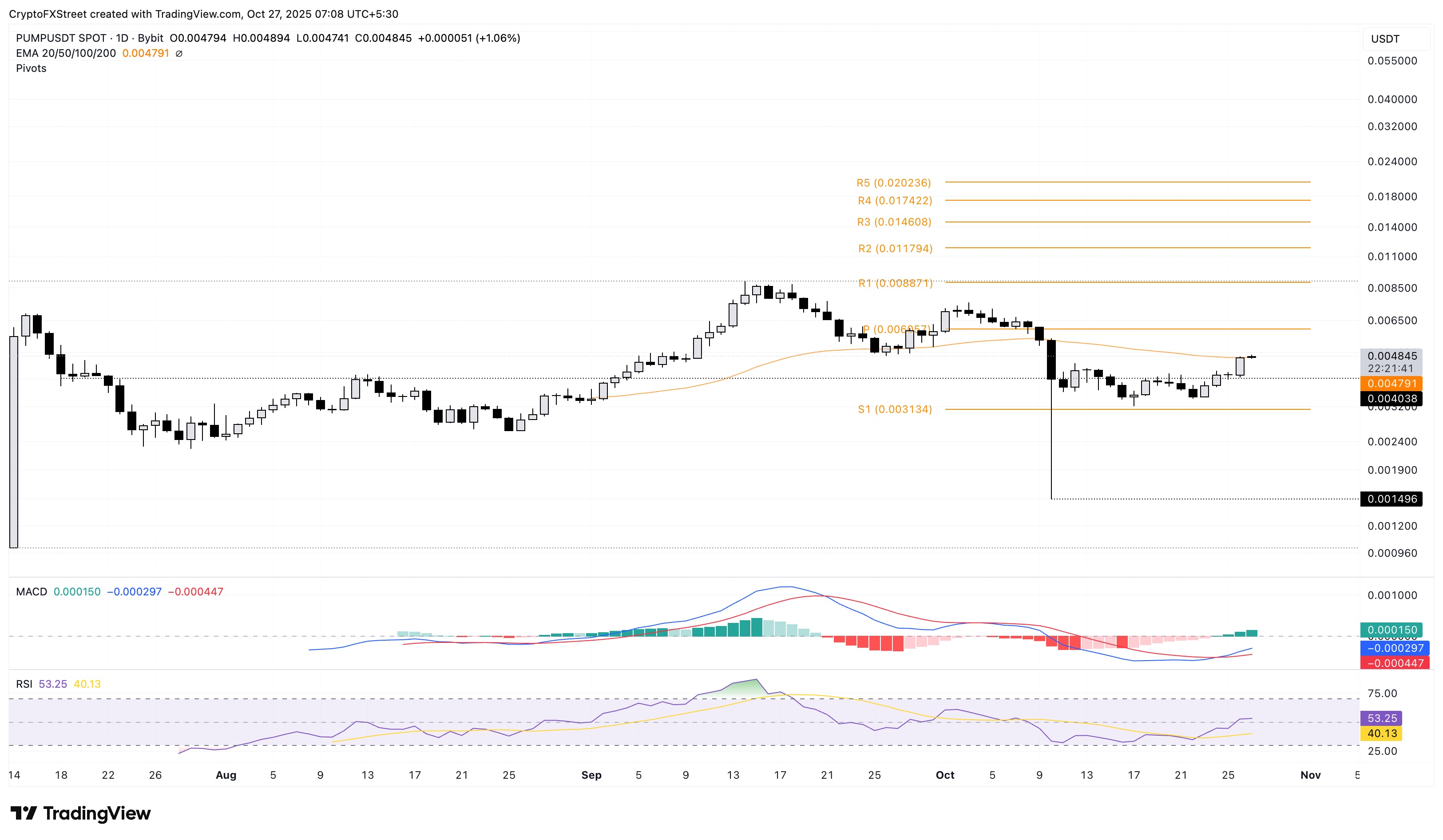 - Pump.fun ổn định sau khi tăng 15% vào Chủ Nhật, với những người đầu cơ đang nhắm tới mốc tâm lý 0,005000 đô la.