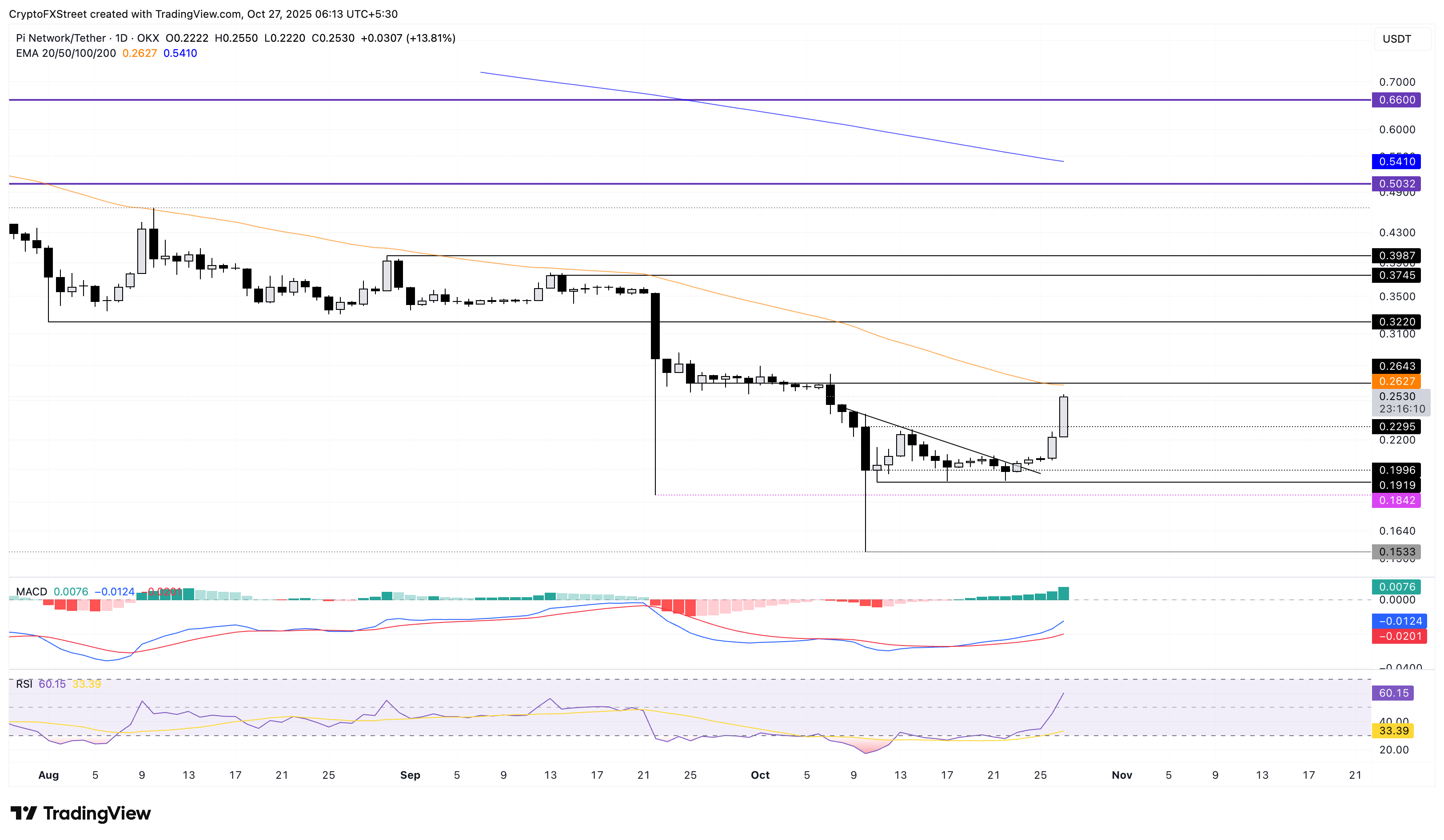 Pi Network đang giao dịch trên mức 0,2500 đô la vào thời điểm viết bài hôm thứ Hai, tiến gần đến đường trung bình động hàm mũ (EMA) 50 ngày ở mức 0,2627 đô la. Tính đến thời điểm hiện tại, token PI đã tăng 13% trong ngày, tiếp nối mức tăng 7% từ Chủ nhật.