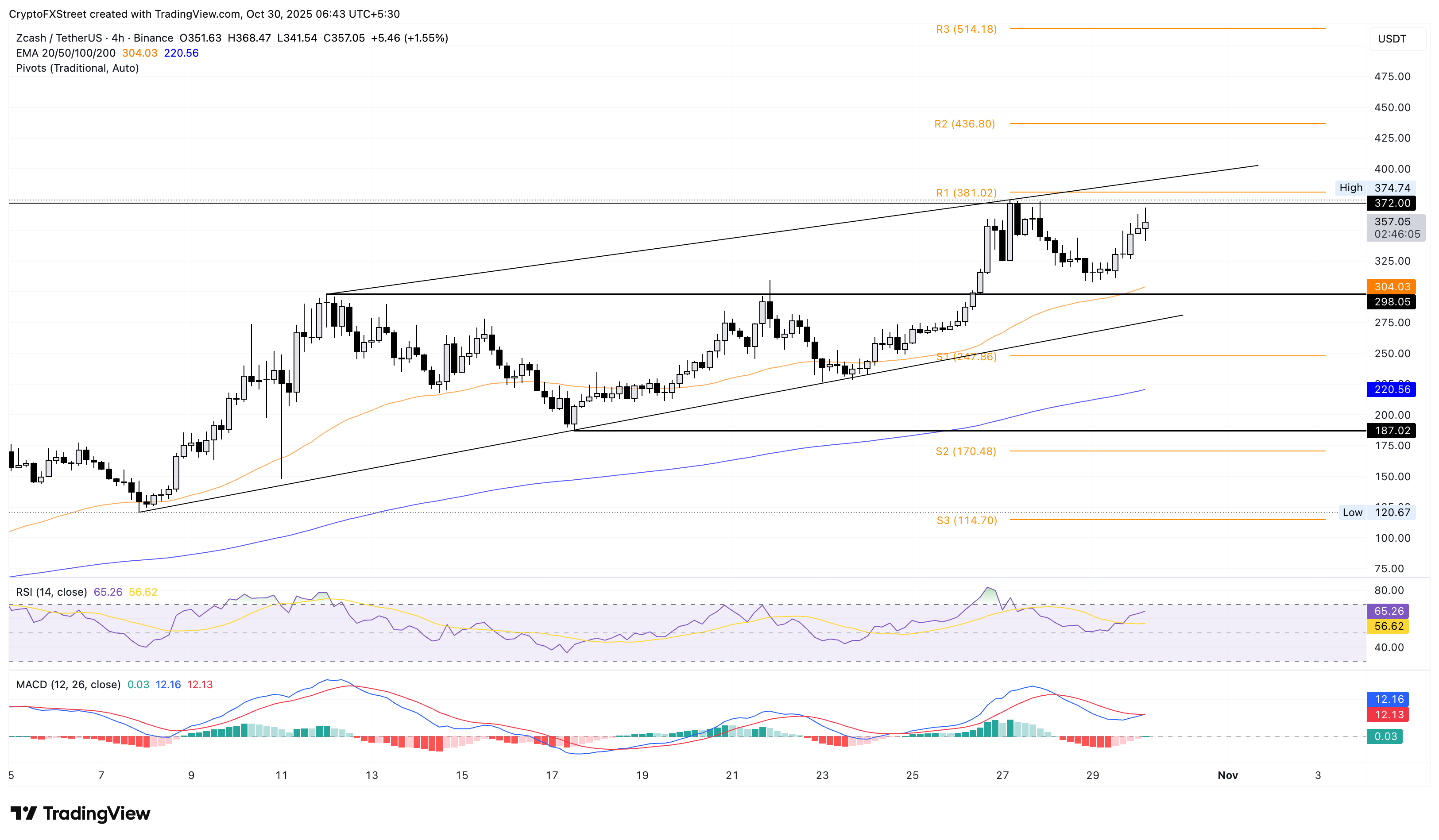 Zcash giao dịch trên mức 350 đô la vào thời điểm viết bài hôm thứ Năm, sau mức tăng 11% của ngày hôm trước. Đồng tiền riêng tư này hướng đến mức cao kỷ lục 374 đô la, được thiết lập vào thứ Hai, gần đường xu hướng kháng cự tăng dần trên biểu đồ 4 giờ, ở mức 390 đô la.