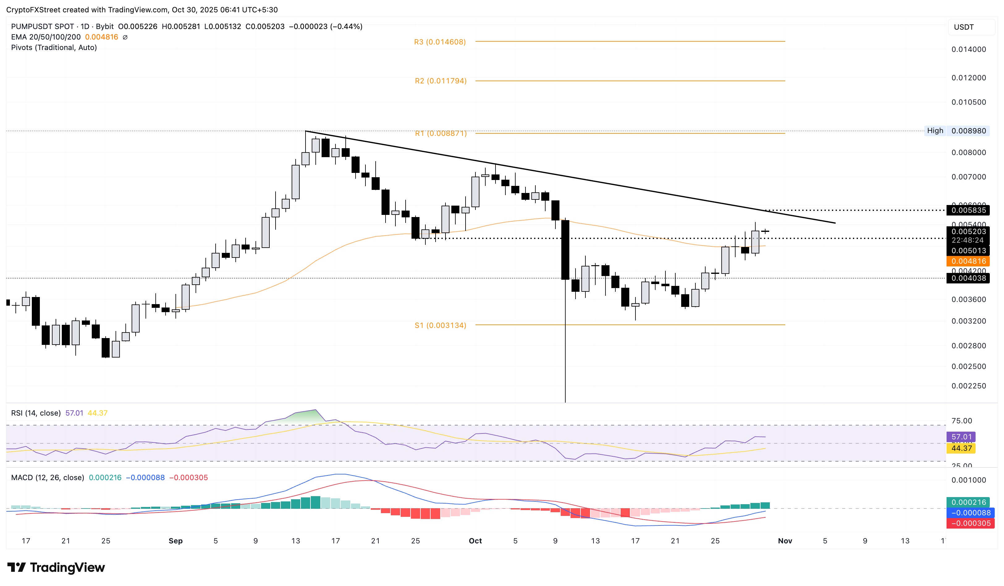 Nếu PUMP đảo ngược từ mức 0,005835 đô la, nó có thể kiểm tra lại đường EMA 50 ngày ở mức 0,004816 đô la.