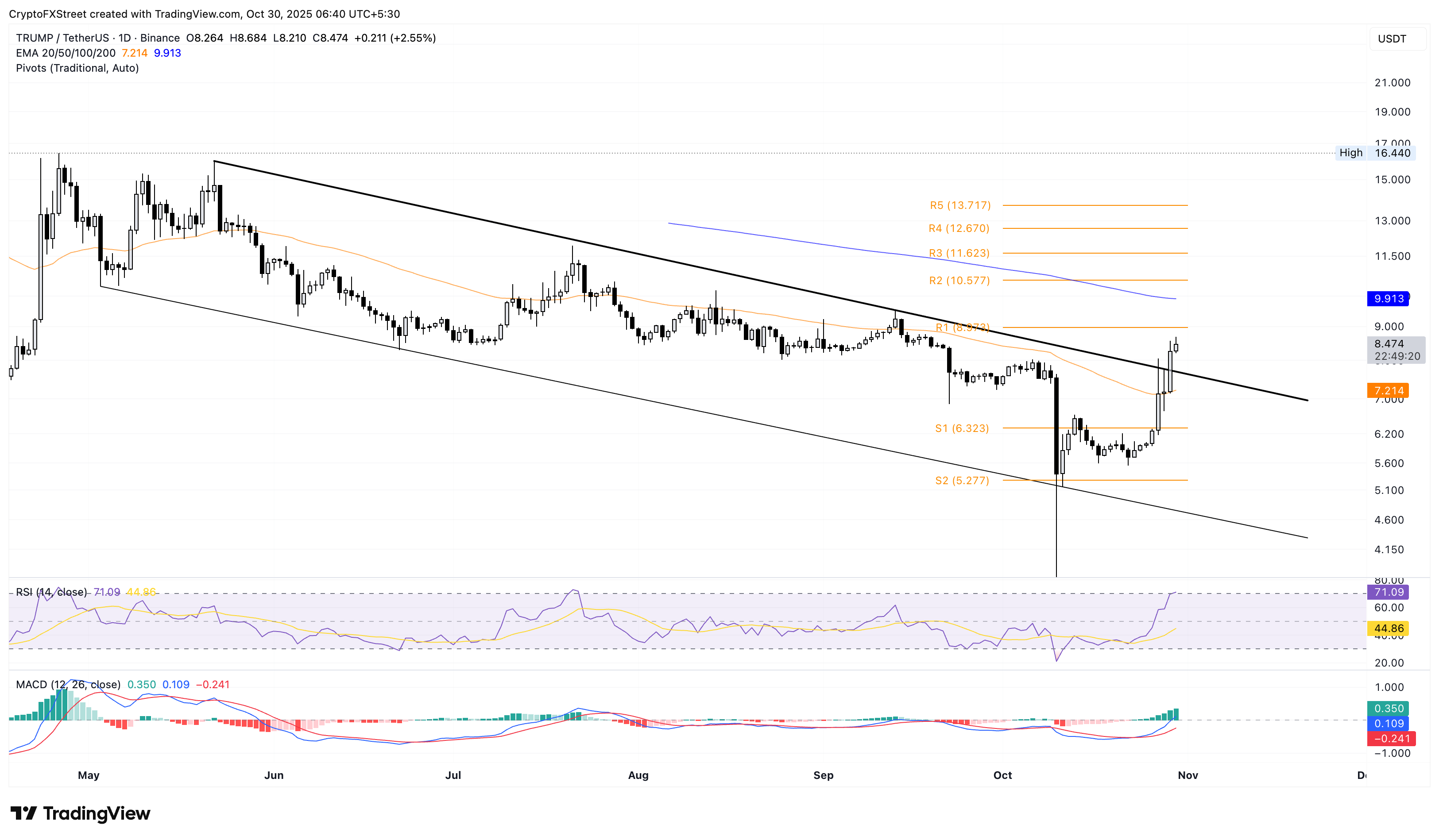 Nếu TRUMP vượt qua mức này, ngưỡng kháng cự quan trọng tiếp theo sẽ là Đường trung bình động hàm mũ 200 ngày (EMA) ở mức 9,913 đô la và Điểm trục R2 ở mức 10,577 đô la.