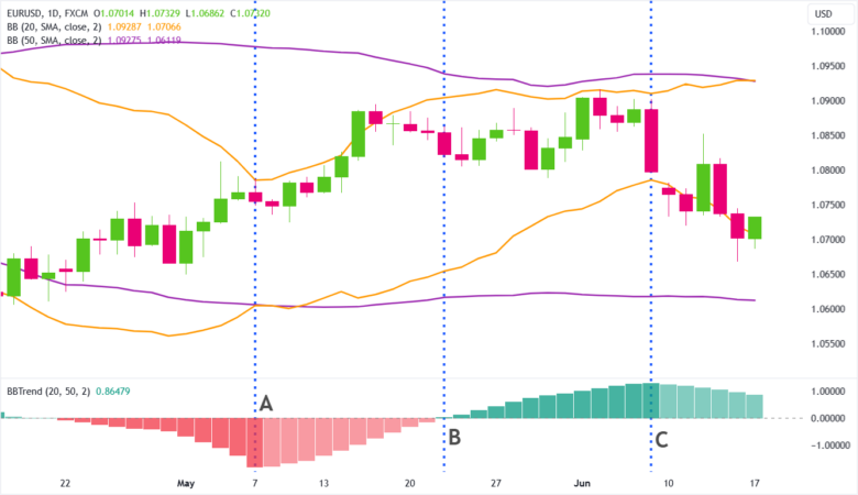 BBTrend bắt nguồn từ việc quan sát hành vi của các nhà giao dịch ghép nhiều Bollinger Bands, đặc biệt là 20 ngày và 50 ngày, trên một biểu đồ duy nhất.