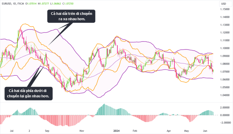 Các dải này giãn rộng và thu hẹp dựa trên độ biến động của thị trường, giúp các nhà giao dịch xác định tình trạng mua quá mức và bán quá mức.