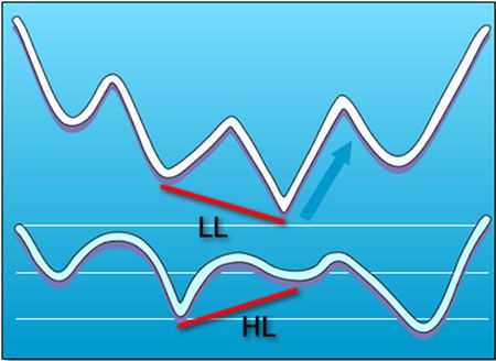 Sau khi xác lập đáy thứ hai, nếu bộ dao động không tạo thành một đáy mới, có khả năng giá sẽ tăng lên, vì giá và động lượng thông thường được kỳ vọng sẽ di chuyển cùng nhau.