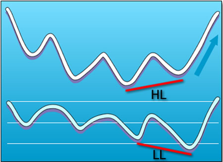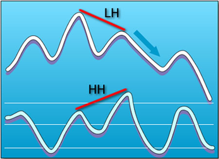 Điều này xảy ra khi giá tạo đỉnh thấp hơn (LH), nhưng bộ dao động lại tạo đỉnh cao hơn (HH).