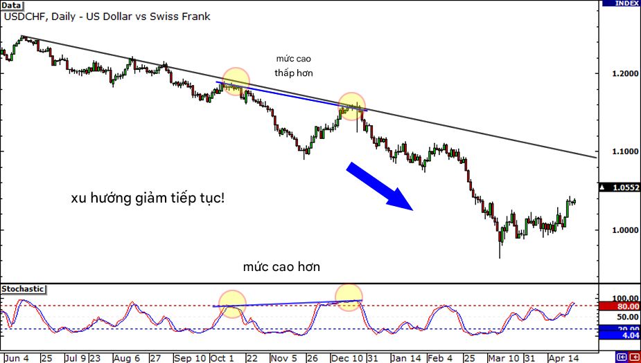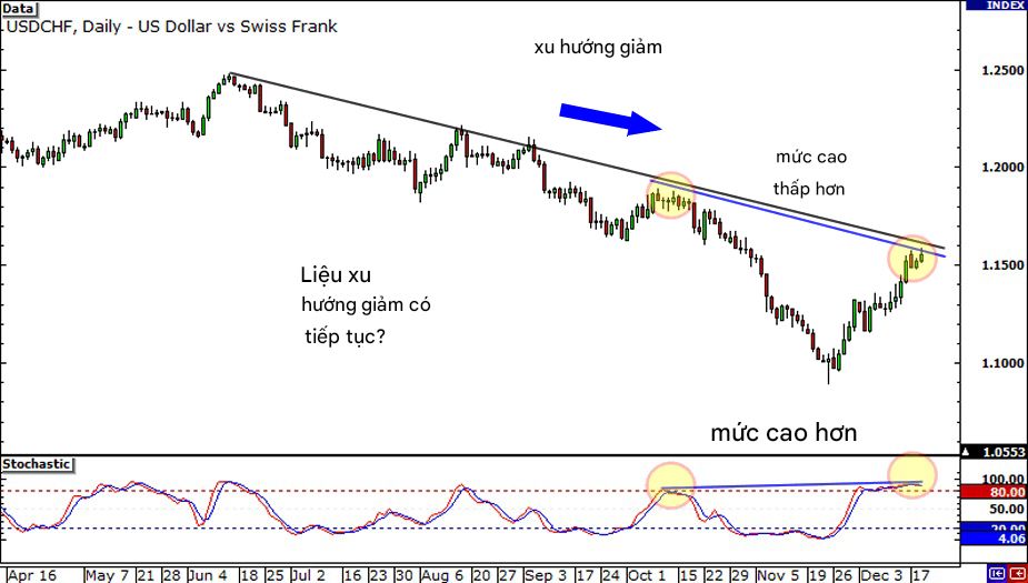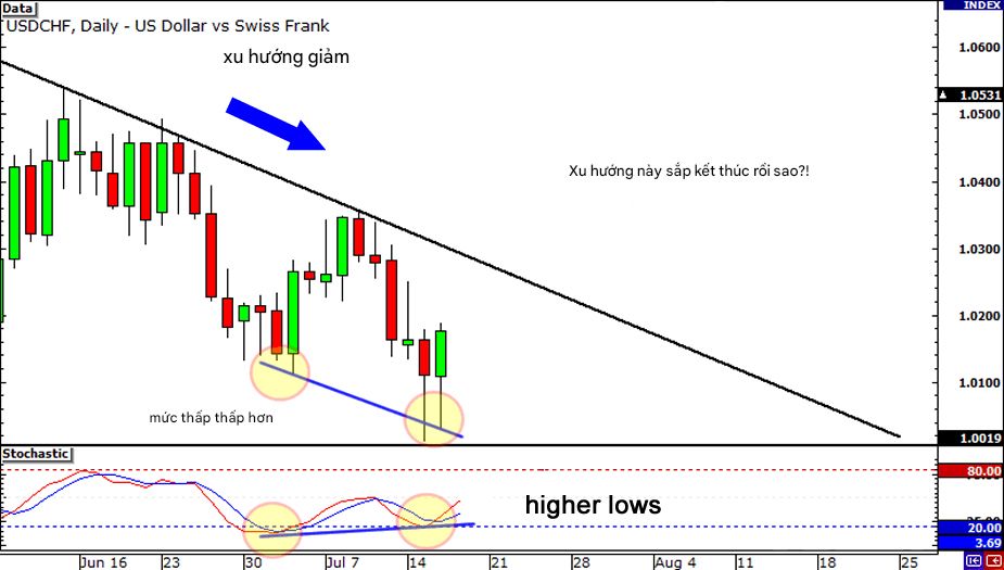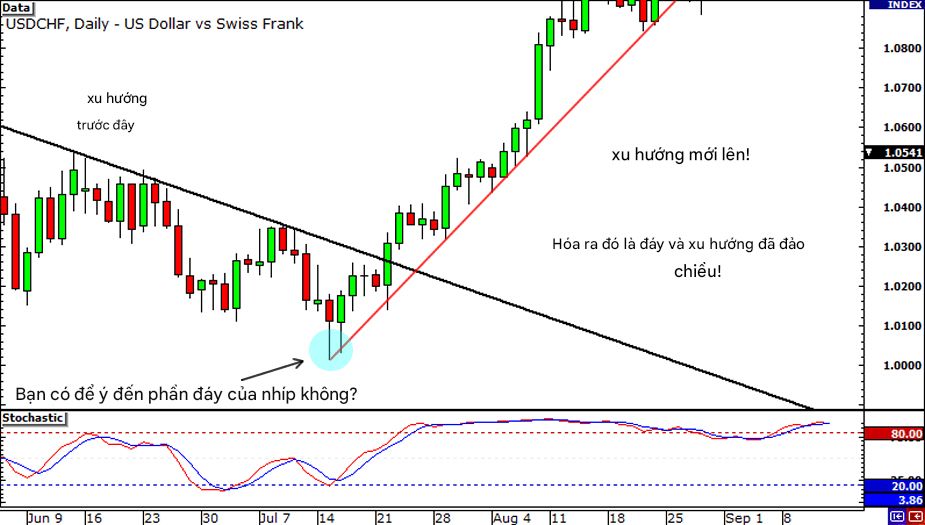 Khi giá đã tạo ra đáy thấp hơn, Stochastic (chỉ báo mà chúng tôi chọn) lại cho thấy đáy cao hơn.