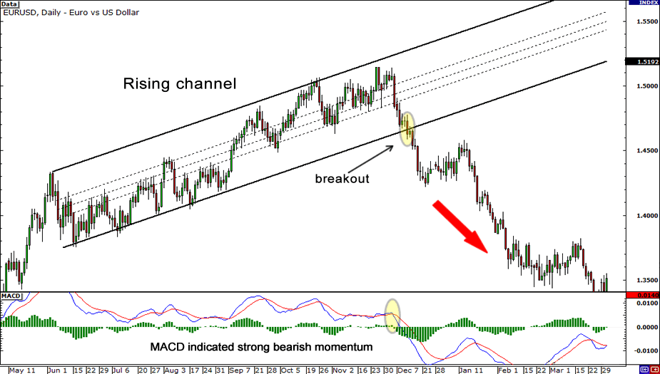 Lưu ý rằng khi EUR/USD phá vỡ đường xu hướng, MACD đã cho thấy động lượng giảm giá.