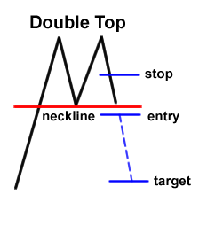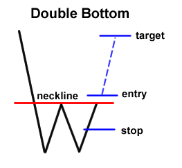 Chẳng hạn, nếu bạn thấy một đáy kép, hãy đặt lệnh mua tại đỉnh của đường cổ của hình thành và nhắm đến mục tiêu cao bằng khoảng cách từ đáy đến đường cổ.