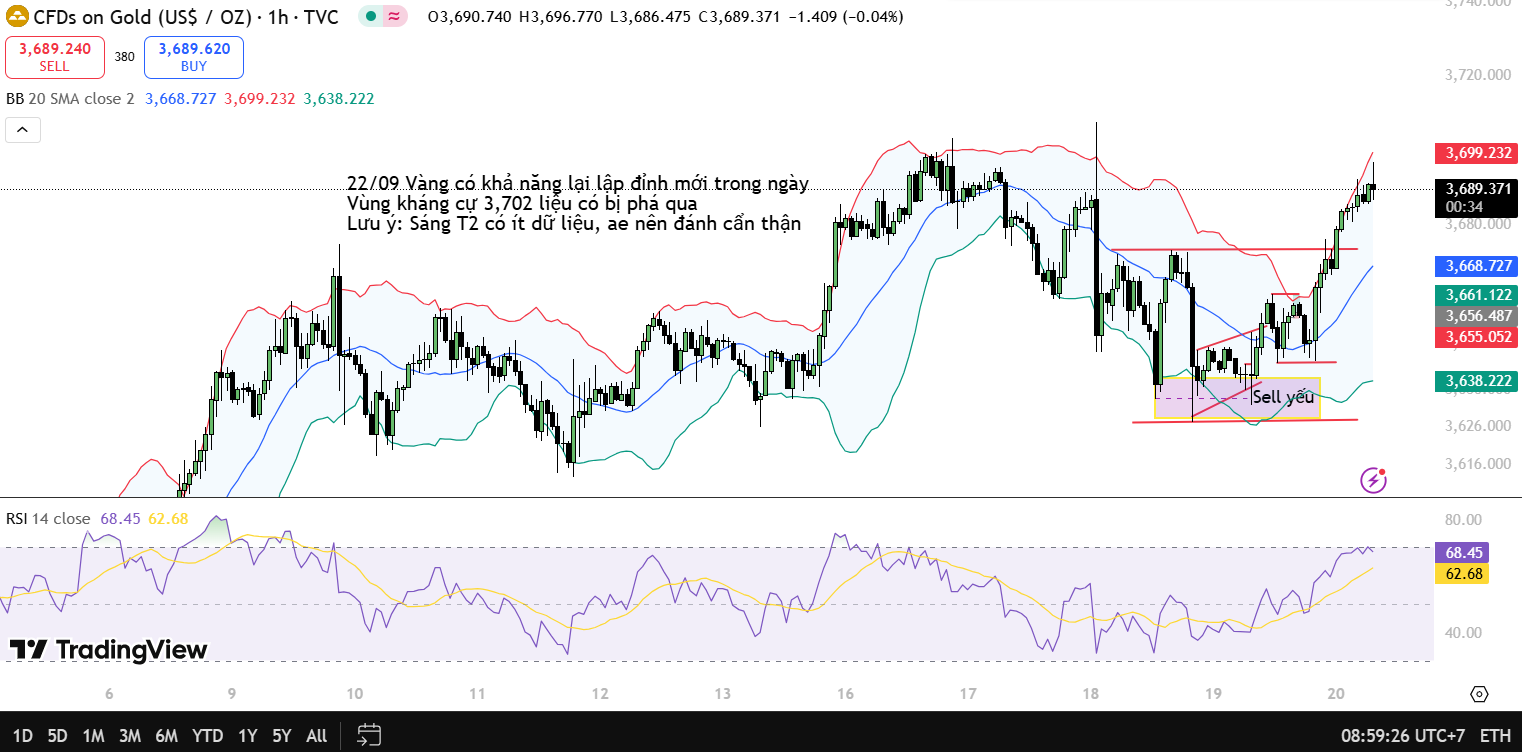 Ngày 22/09 hứa hẹn một phiên giao dịch đáng chú ý khi vàng đang đứng trước cơ hội lập đỉnh mới. Tuy nhiên, vùng 3,702 là rào cản lớn, cần sự bứt phá rõ ràng kèm khối lượng. Trong bối cảnh sáng Thứ Hai ít dữ liệu, nhà đầu tư nên giao dịch cẩn trọng, quản lý vốn chặt chẽ và không nên FOMO khi giá dao động mạnh quanh vùng đỉnh.