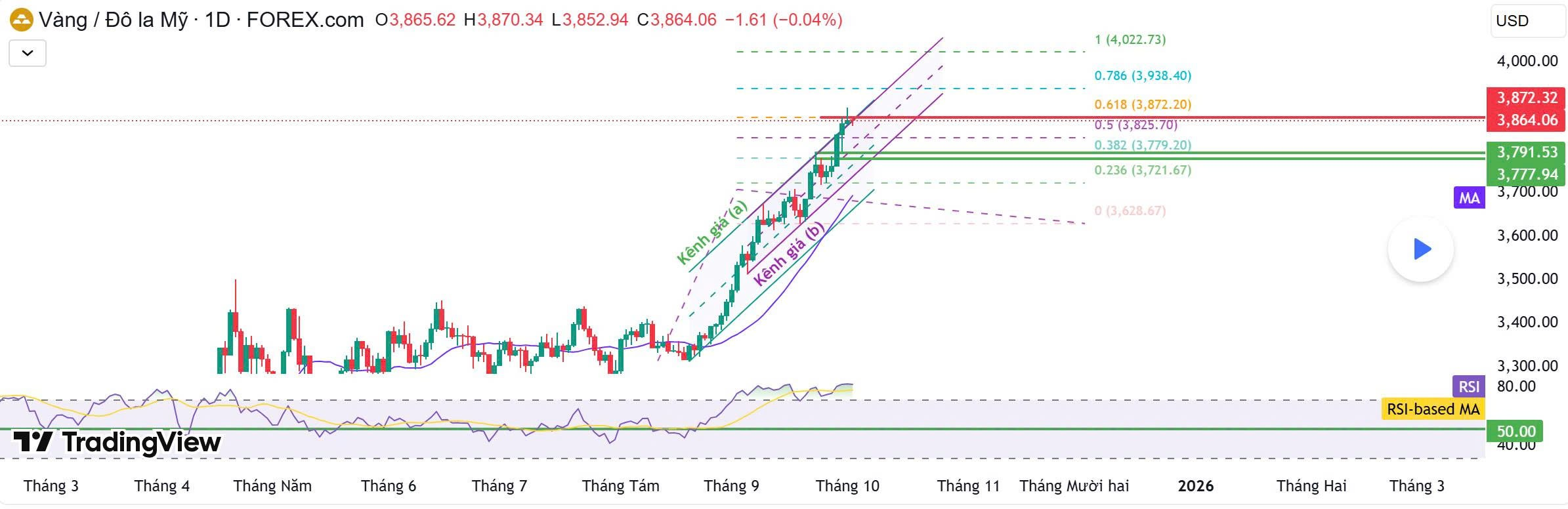 Trên biểu đồ ngày , XAU/USD đang di chuyển trong kênh giá tăng khá rõ ràng. Hiện tại giá đã tiến sát vùng kháng cự Fibonacci 0.618 tại 3,872 USD, đồng thời RSI cũng tiến vào vùng quá mua, cho thấy lực tăng có phần bị “nóng” trong ngắn hạn.