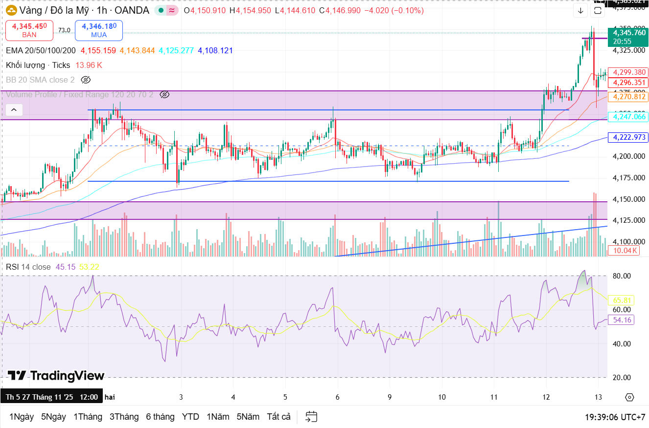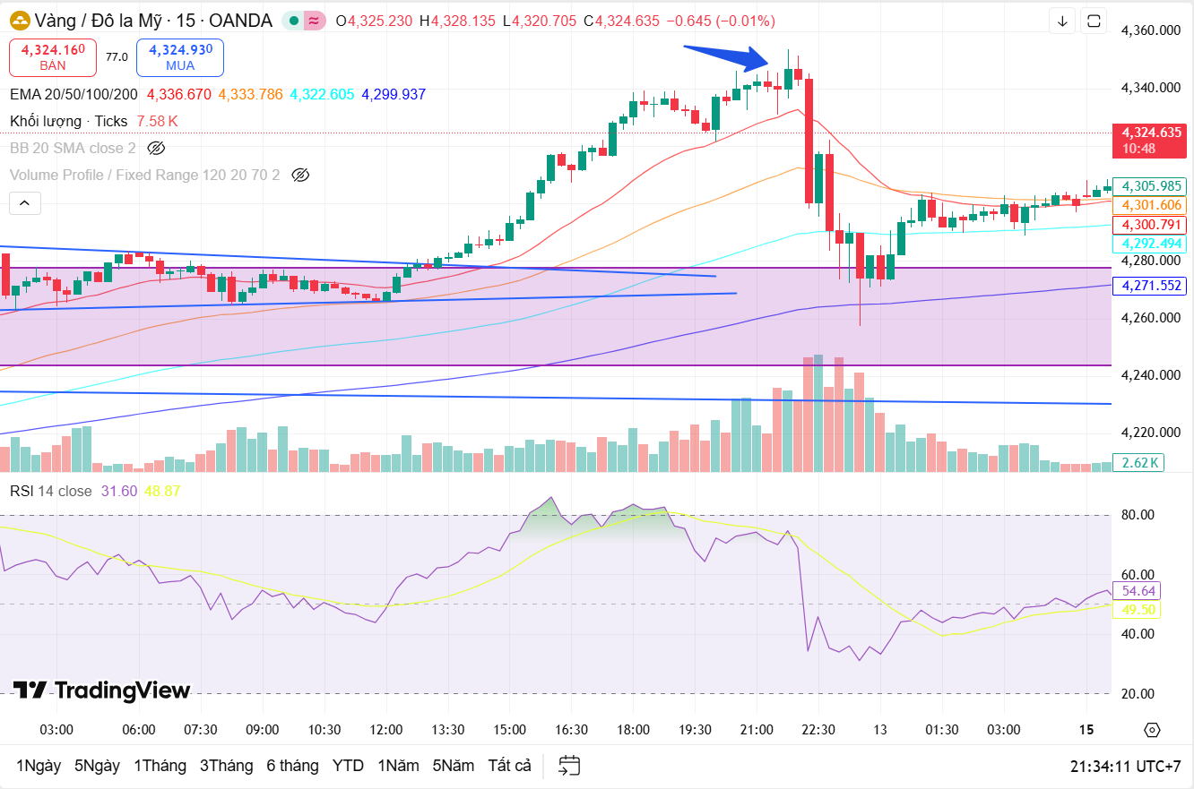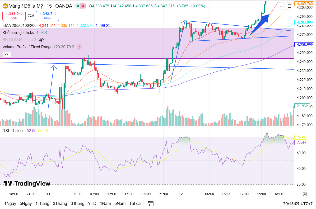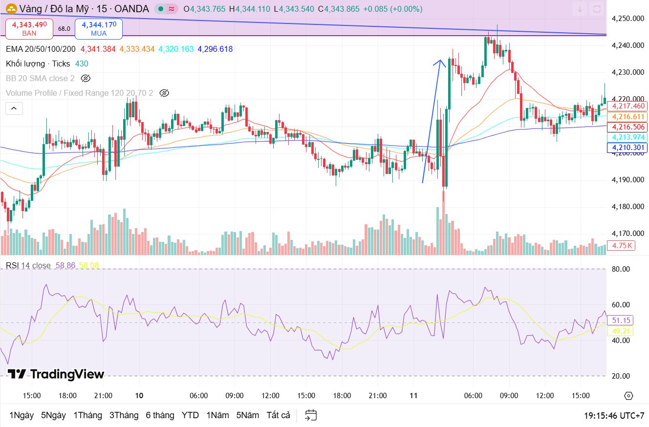 Trước công bố của FED, thị trường đã ở trong giai đoạn tích lũy kéo dài hơn 1 tuần. Vận động giá liên tục xoay quanh cụm các đường EMA, giữ biên độ giao động hẹp trong vùng 4170 - 4250. Chính giai đoạn vô hướng này đã tạo tiền đề về mặt động lượng cho những phiên sau.