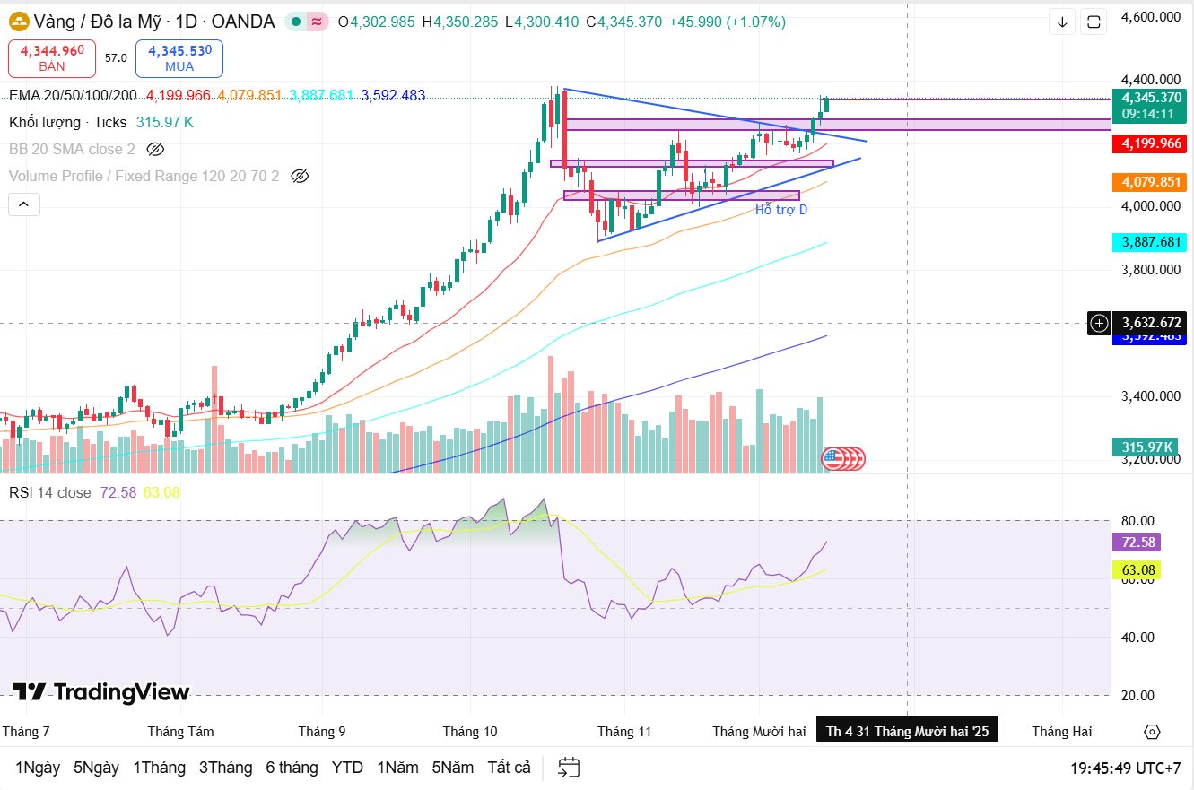 Sau khi lập đỉnh lịch sử vào hồi tháng 11, biểu đồ khung ngày cũng cho thấy XAUUSD đã hình thành mô hình tích lũy tam giác cân khi liên tục giữ được nền tăng sau các nhịp điều chỉnh. Bản thân cấu trúc tăng của các đường EMA cũng được giữ vững và chỉ số RSI nằm trên mức 50, cho thấy sự thất bại của phe bán trong việc kiểm soát thị trường