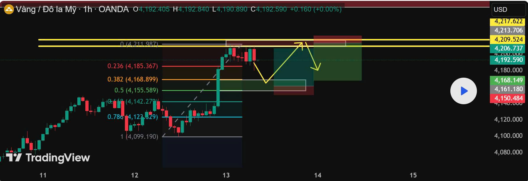 Vàng đang giữ nhịp tăng chủ đạo trên H1 – H4 sau khi tạo vùng đáy quanh 4.095 – 4.100 và bật phục hồi rất chắc lên 4.210. Lực mua hiện vẫn chiếm ưu thế, tuy nhiên khi tiến gần vùng đỉnh cũ, giá có xu hướng chậm lại – dấu hiệu quen thuộc cho một nhịp điều chỉnh nhẹ nhằm hấp thụ thanh khoản trước khi có đà tăng tiếp.