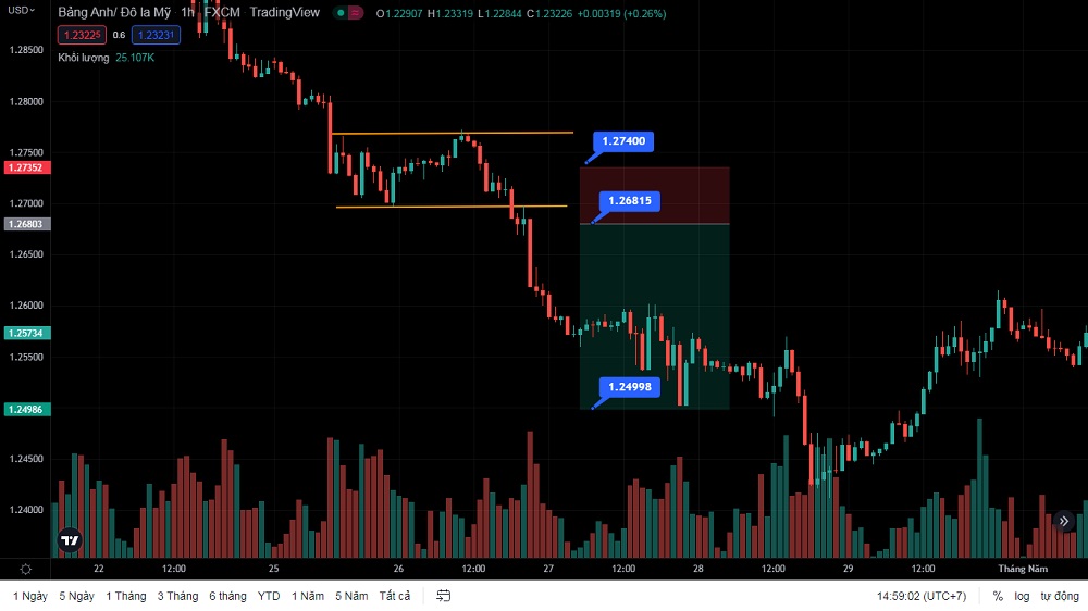 Xét ví dụ sau để dễ hiểu hơn: Cặp tiền GBP/USD trên khung H1 đang có xu hướng Downtrend. Giá của cặp tiền này đang di chuyển trong khoản 28 cây nến, trong vùng 1,268 – 1276. Dự đoán rằng giá có khả năng phá vỡ đường hỗ trợ, sau đó tiếp tục giảm. Để đón đầu xu hướng, nhà đầu tư có thể đặt lệnh Sell Stop bên dưới đường hỗ trợ này một chút.